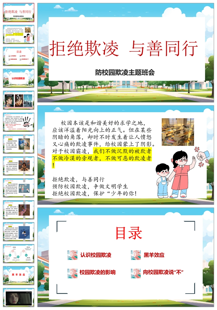 【8326】【预防欺凌】《拒绝欺凌与善同行》拒绝校园欺凌班会PPT(课件含视频+教案)