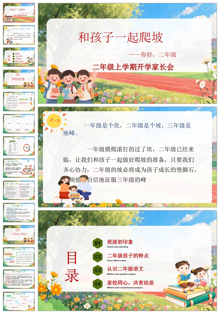 【8538】二年级上学期语文开学家长会《和孩子一起爬坡》二年级语文开学家长会PPT课件+发言稿+暖场视频
