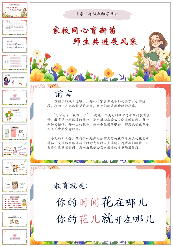 【8284】【三年级家长会】《家校同心育新苗师生共进展风采》小学三年级期中家长会PPT(课件+发言稿+暖场视频)