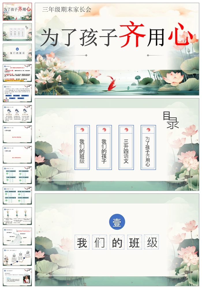 首页 三年级家长会 【8390】【三下家长会】【语文】《为了孩子齐用心》三年级下学期语文期末家长会ppt(课件+发言稿)