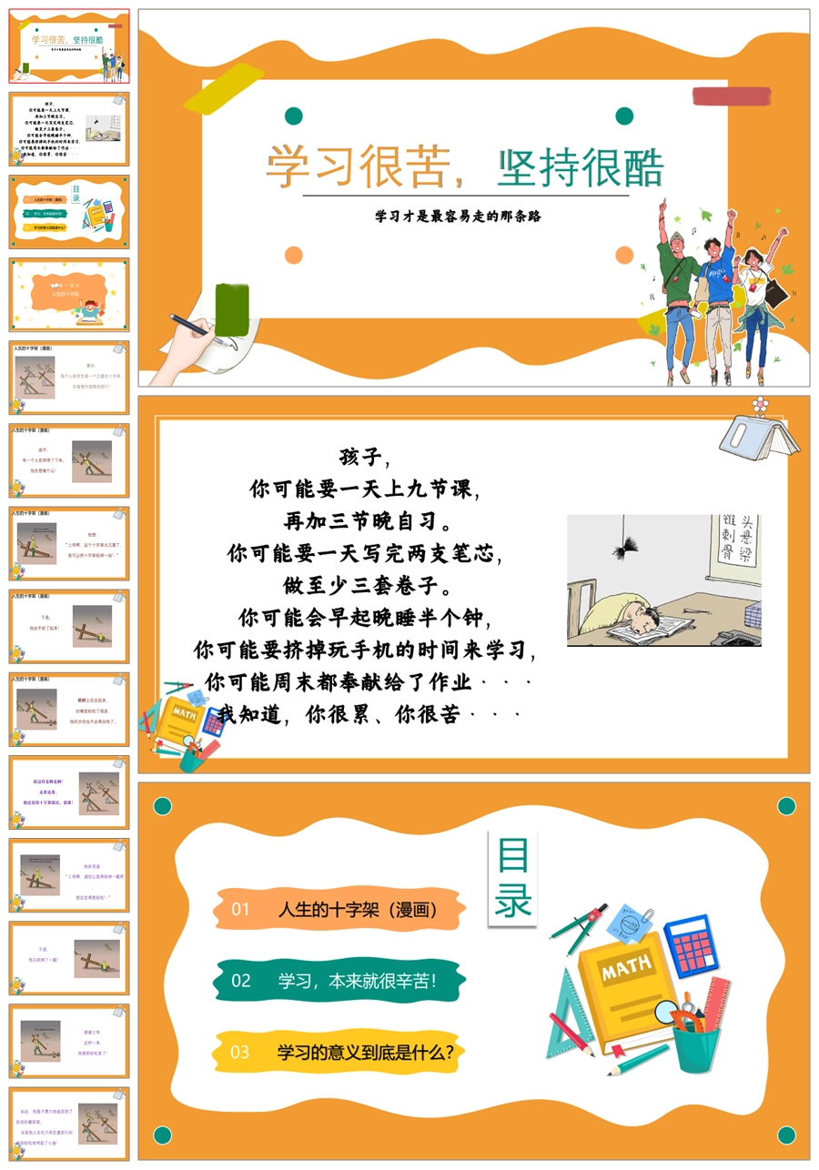 【8489】《学习很苦,但请坚持》励志教育主题班会PPT课件+发言稿