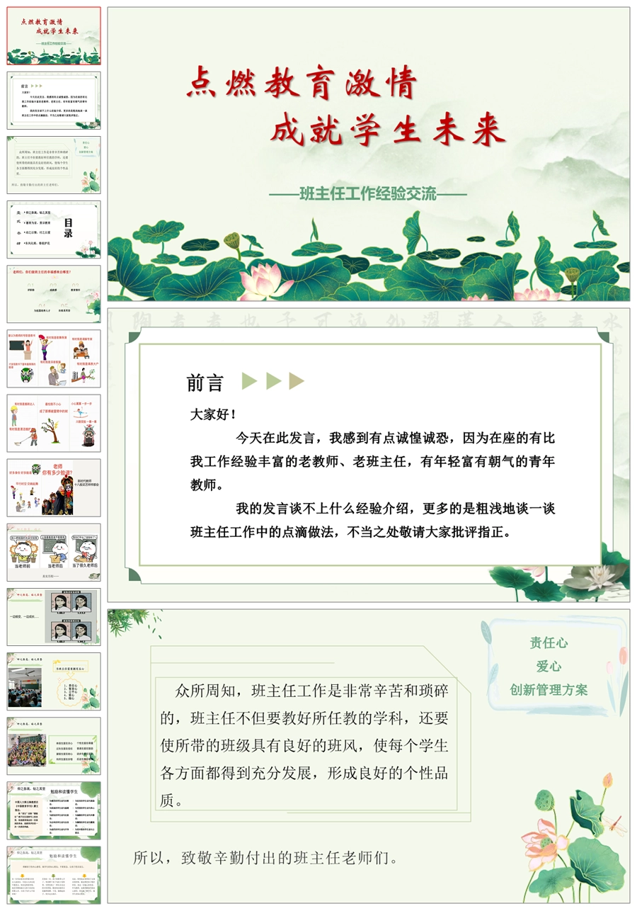 【8250】【经验交流】《点燃教育激情成就学生未来》班主任工作经验交流PPT(课件+发言稿)