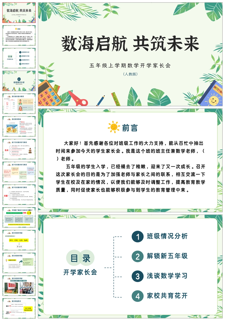 【5153】【五上】【数学】【数海启航,共筑未来】五年级上学期开学家长会-人教版ppt课件+发言稿