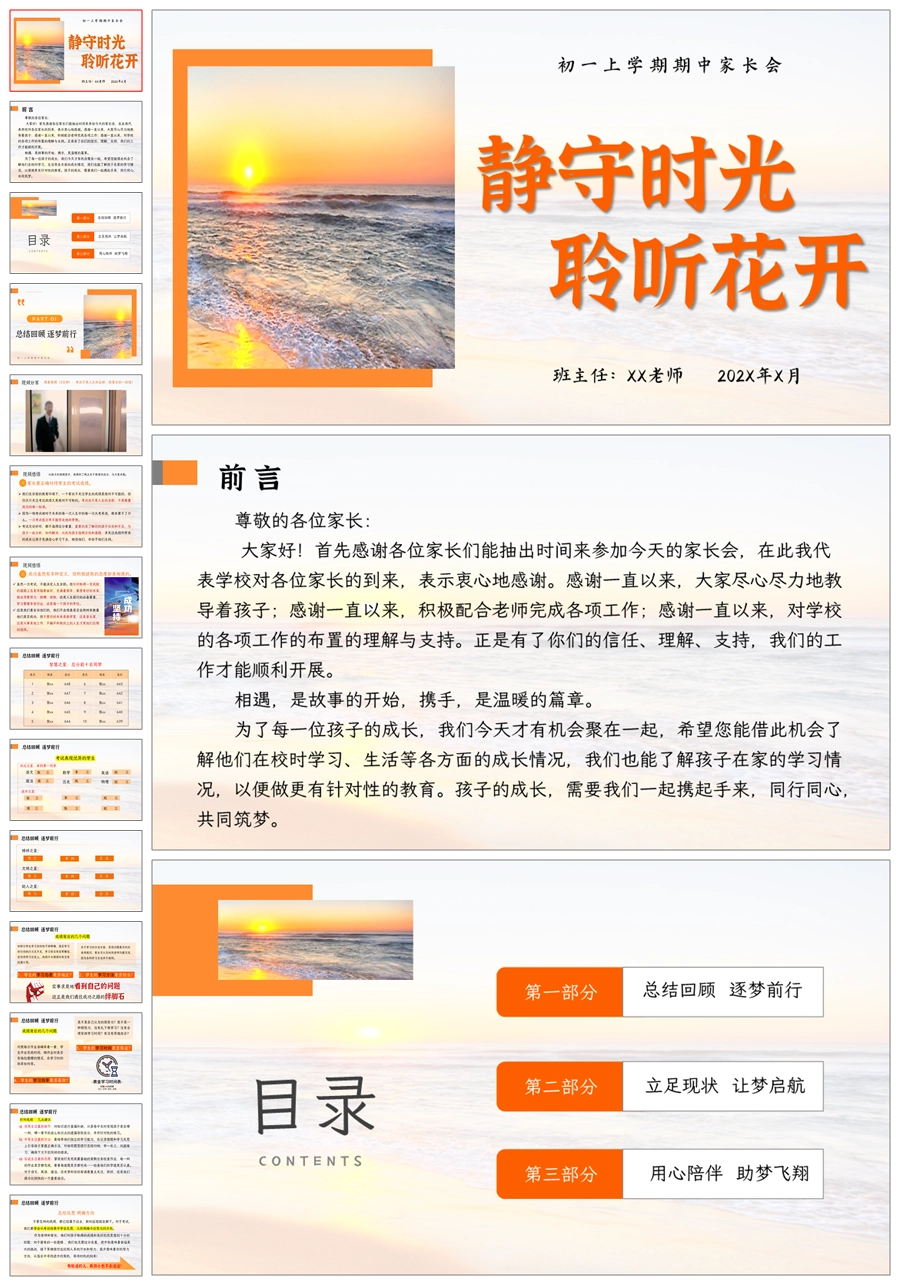 【5214】【初一】【上学期】【静守时光,聆听花开】七年级上学期期中家长会PPT课件+发言稿