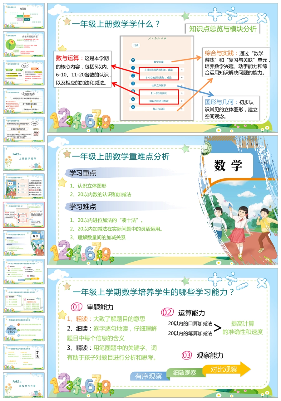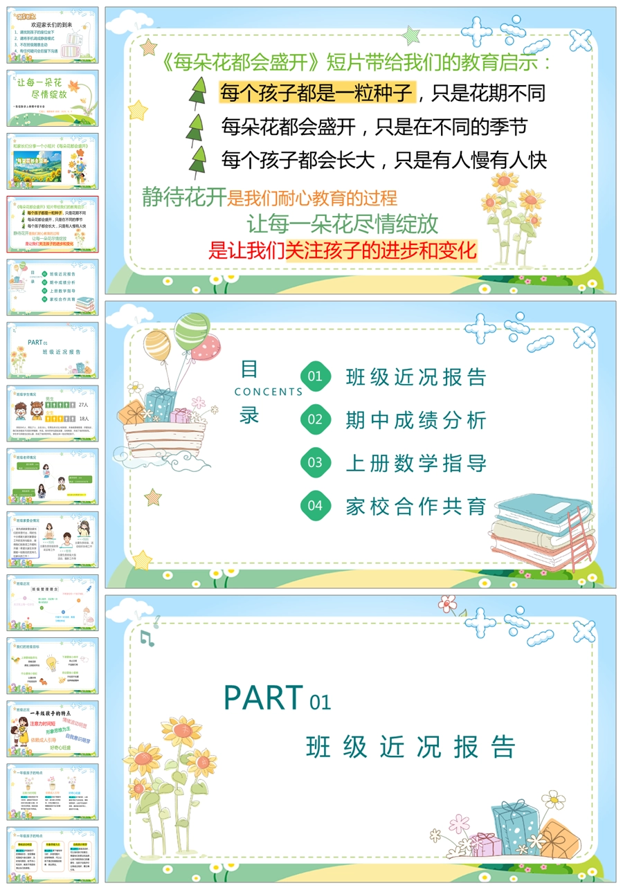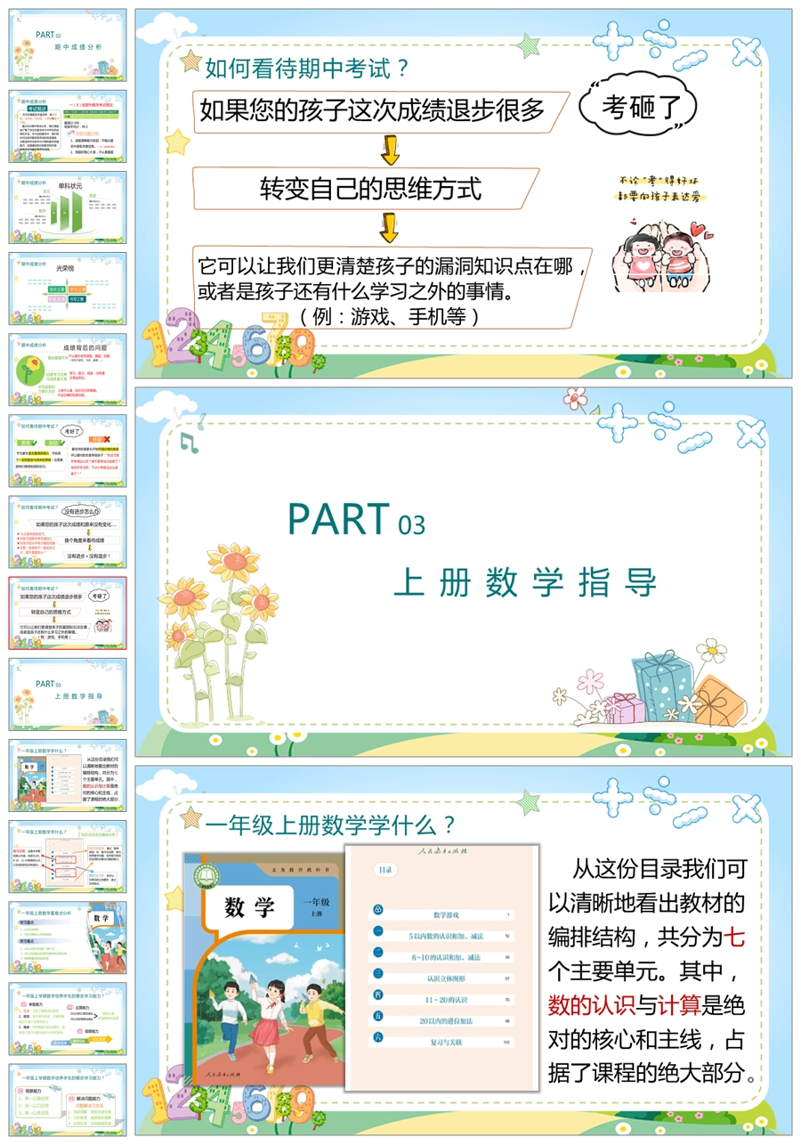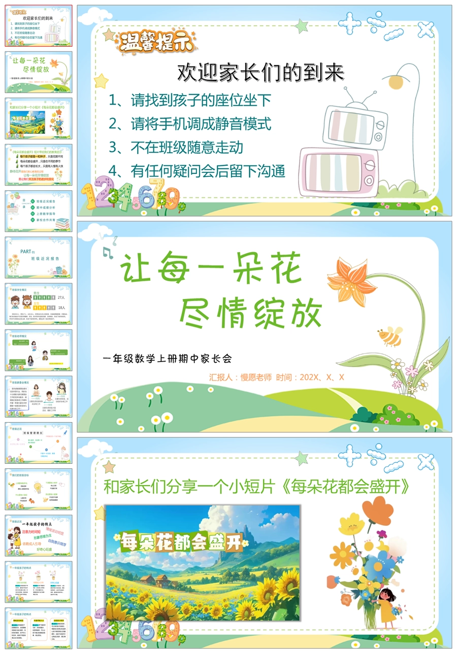 【5232】【一上】【数学】【让每一朵花尽情绽放】一年级上学期期中家长会PPT课件+发言稿