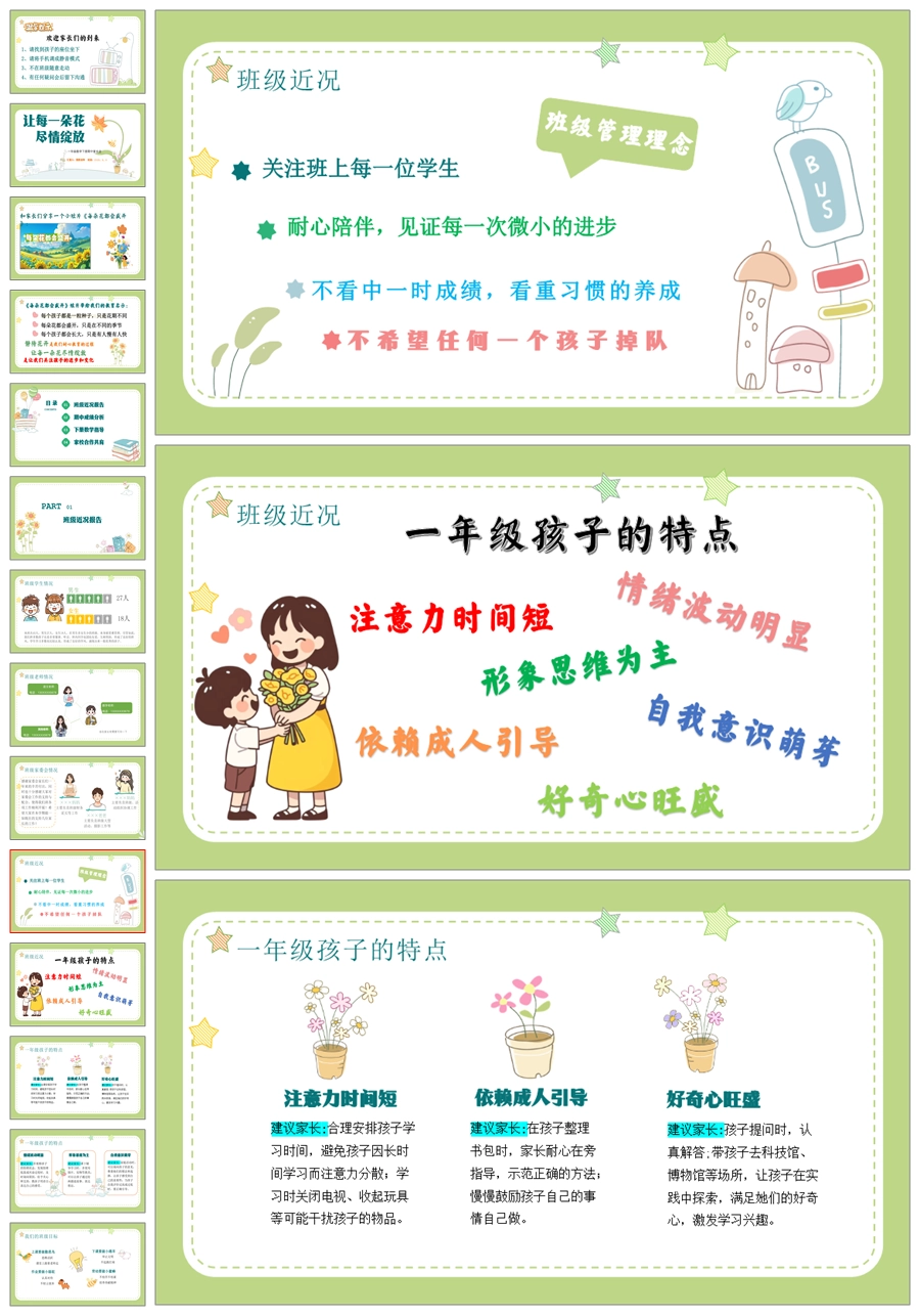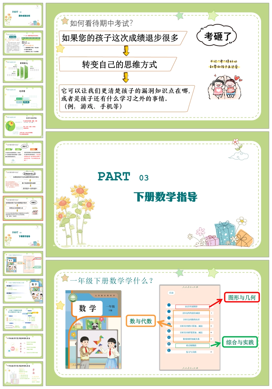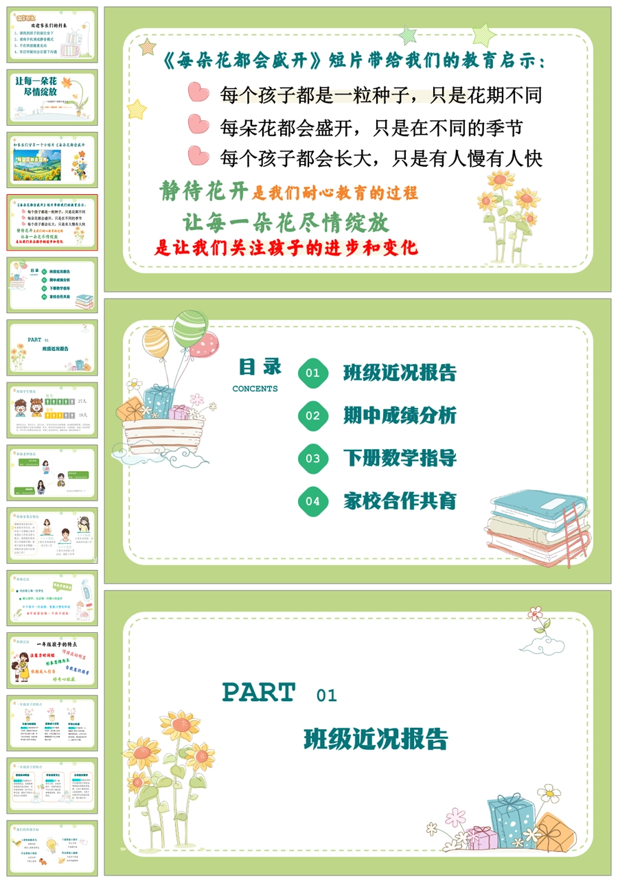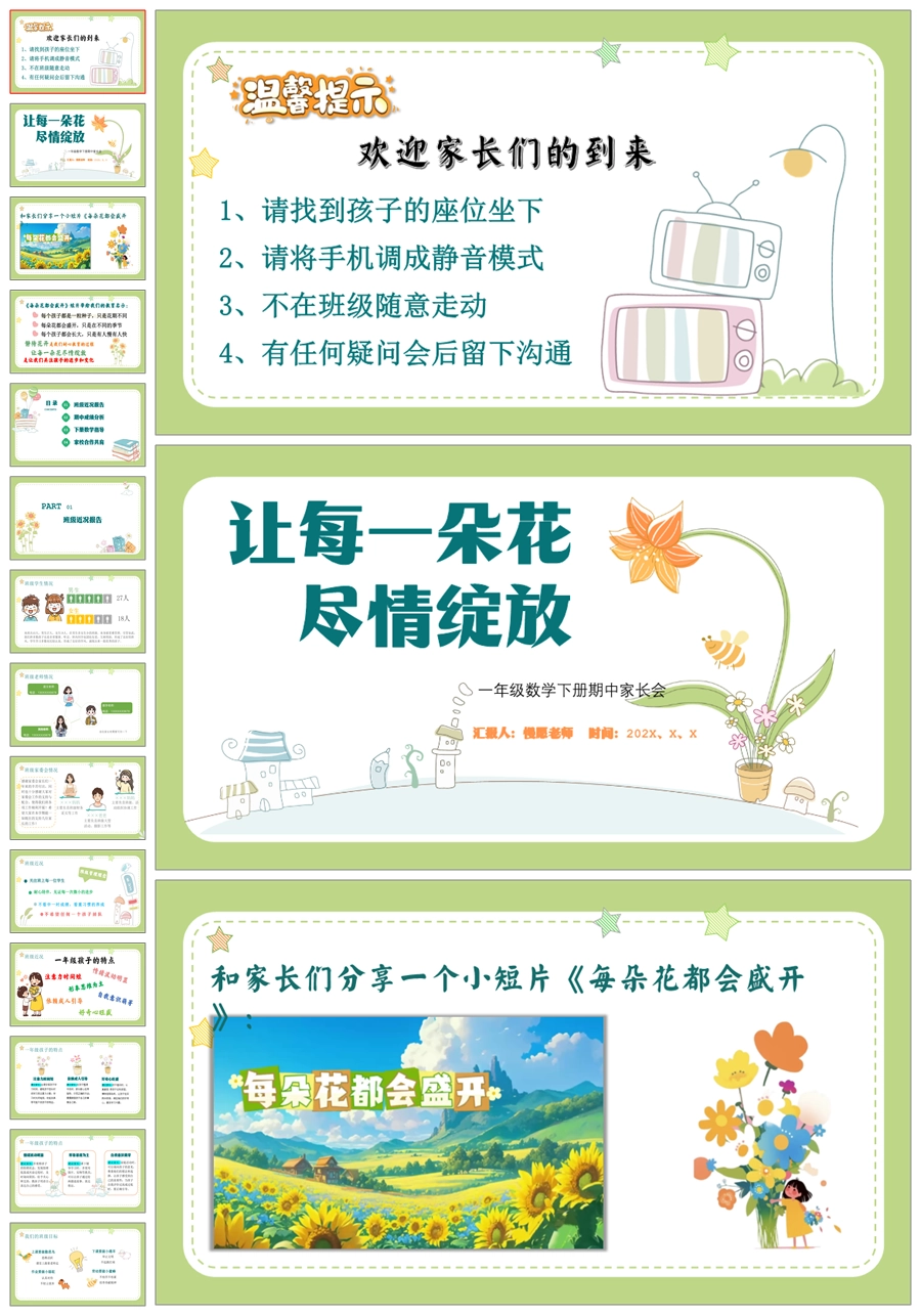 【5260】【一下】数学【让每一朵花尽情绽放】一年级下学期期中家长会PPT课件+发言稿
