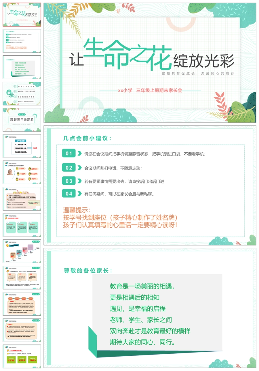 【5315】【三上】【语文】【让生命之花绽放光彩】三年级上学期期末家长会PPT课件+发言稿