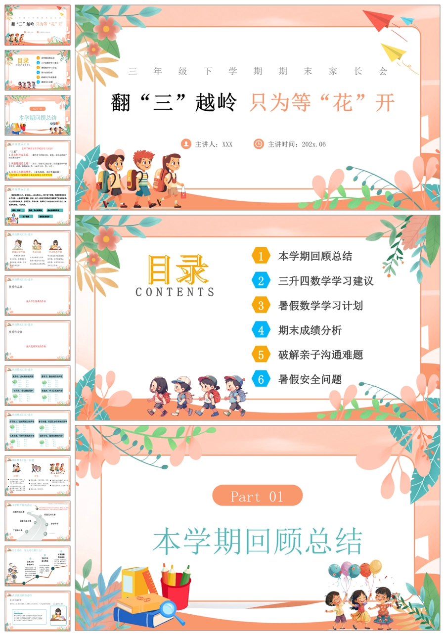 首页 三年级家长会 【5323】【三下】【数学】【翻“三”越岭 只为等“花”开】三年级下学期期末家长会PPT课件+发言稿