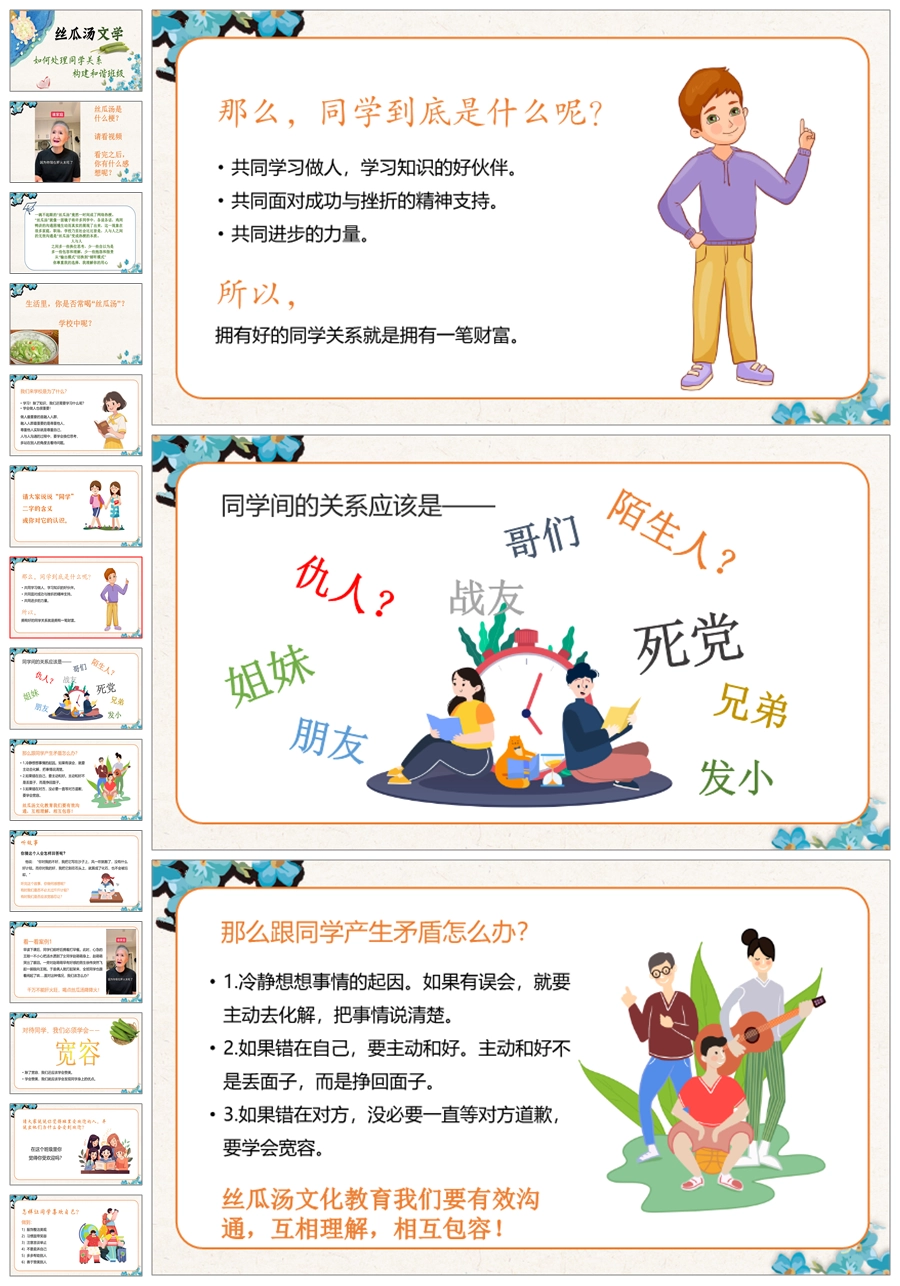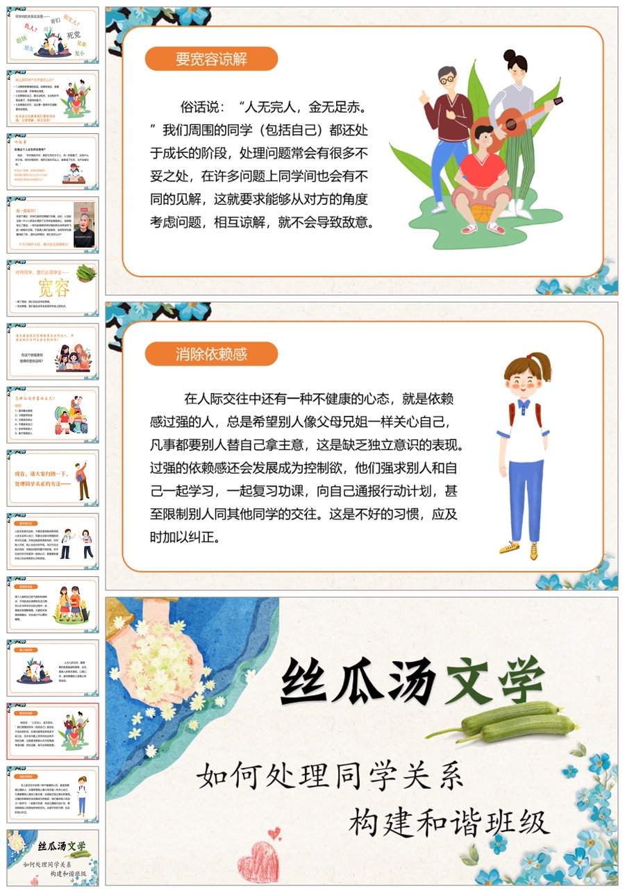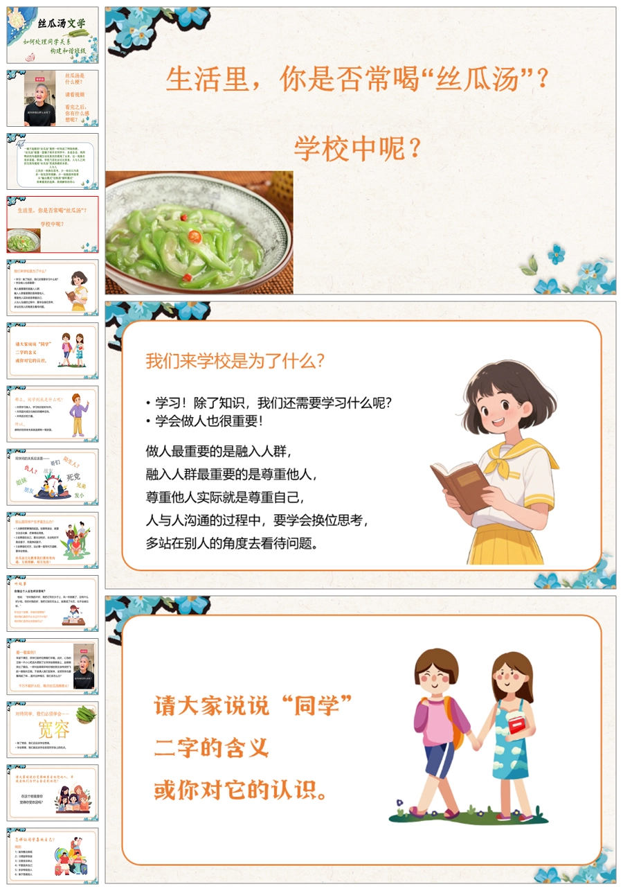 【5449】《丝瓜汤文学:如何正确处理同学关系,构建和谐班级》主题班会ppt课件+发言稿