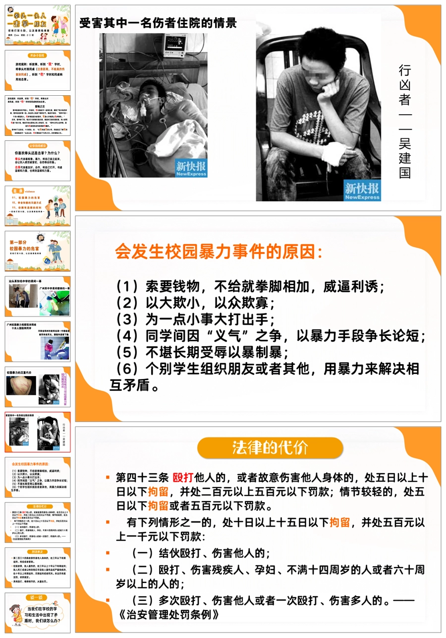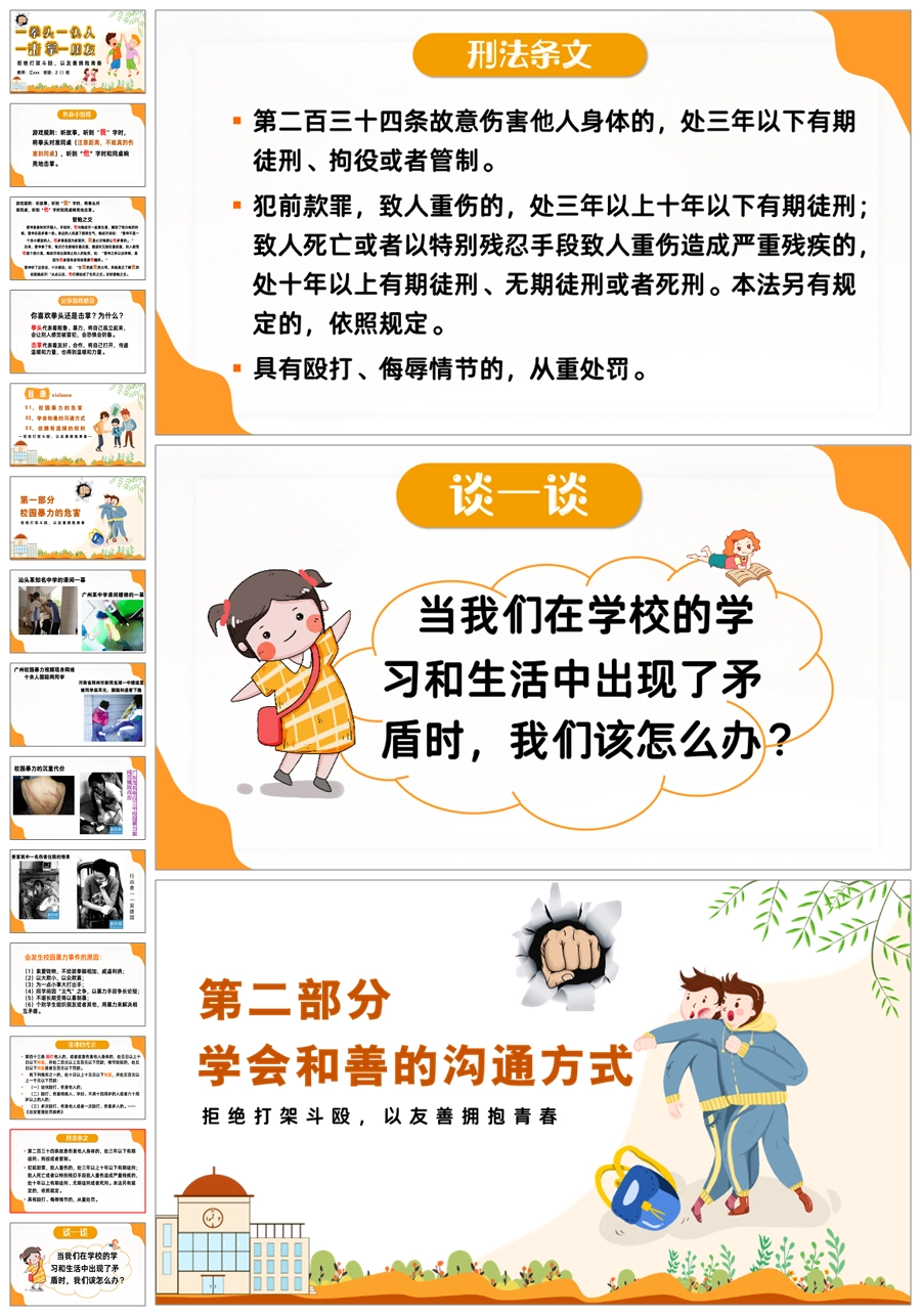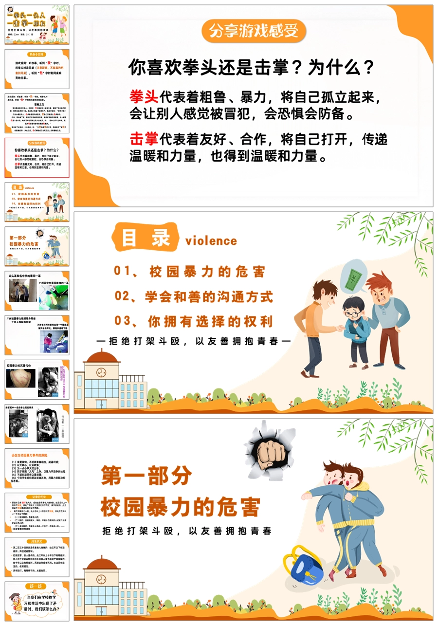 【5510】【校园霸凌】拒绝打架斗殴主题班会《一拳头一仇人,一击掌一朋友》ppt课件+发言稿