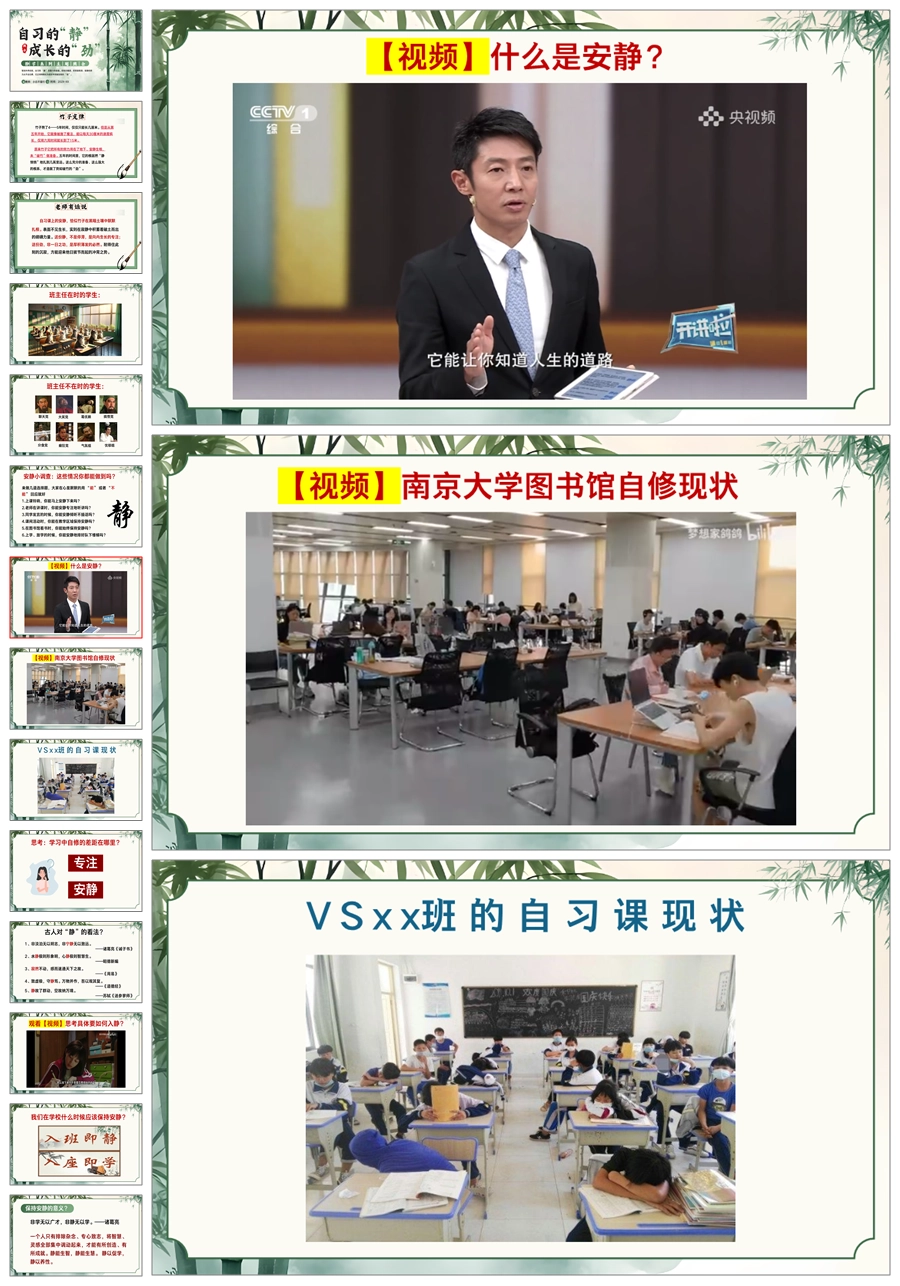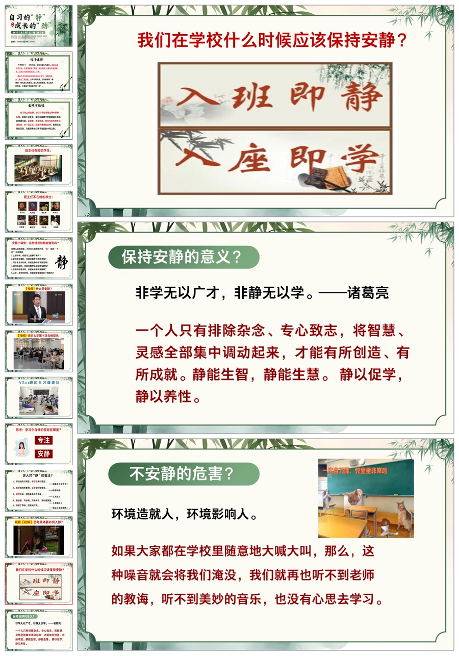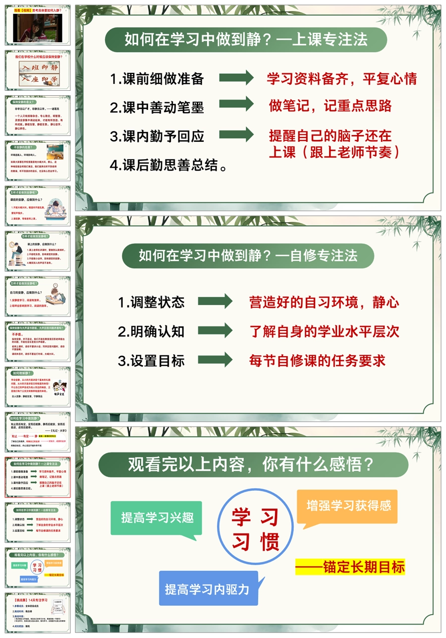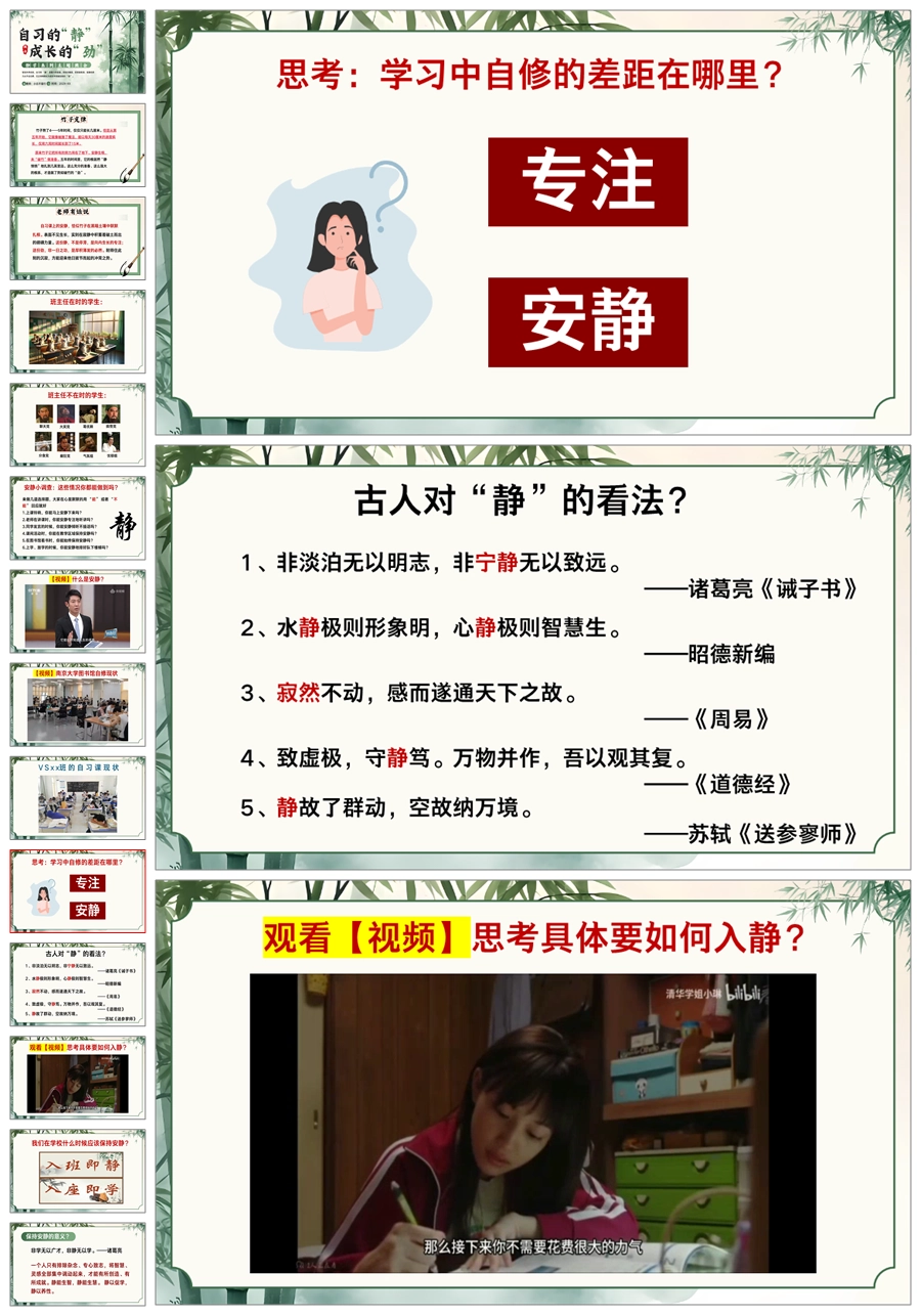 【5525】《自习的“静”成长的“劲”》静学教育主题班会ppt课件+发言稿+视频