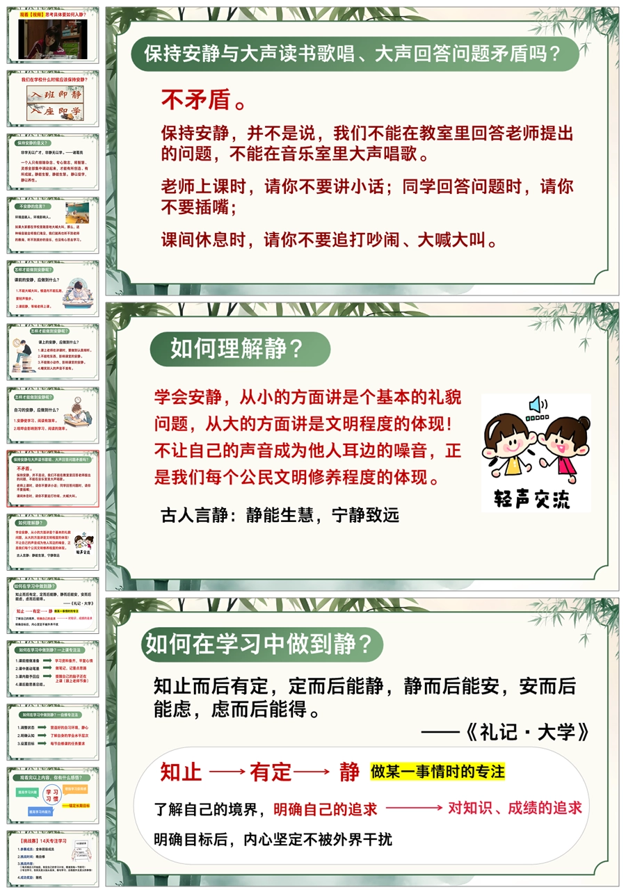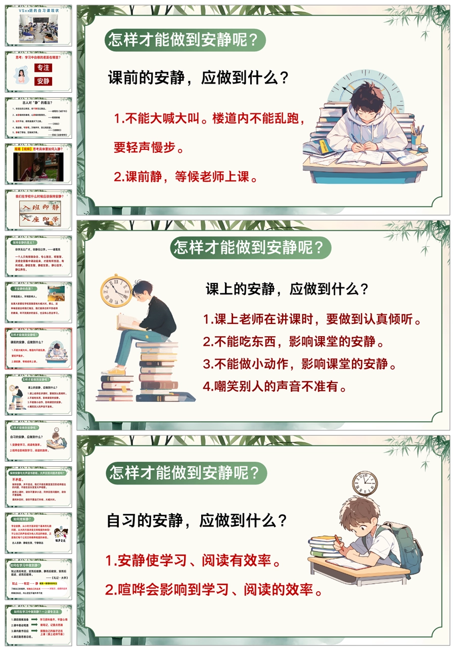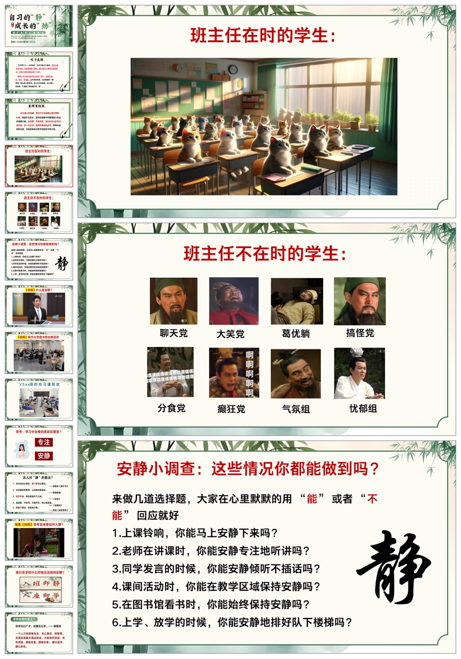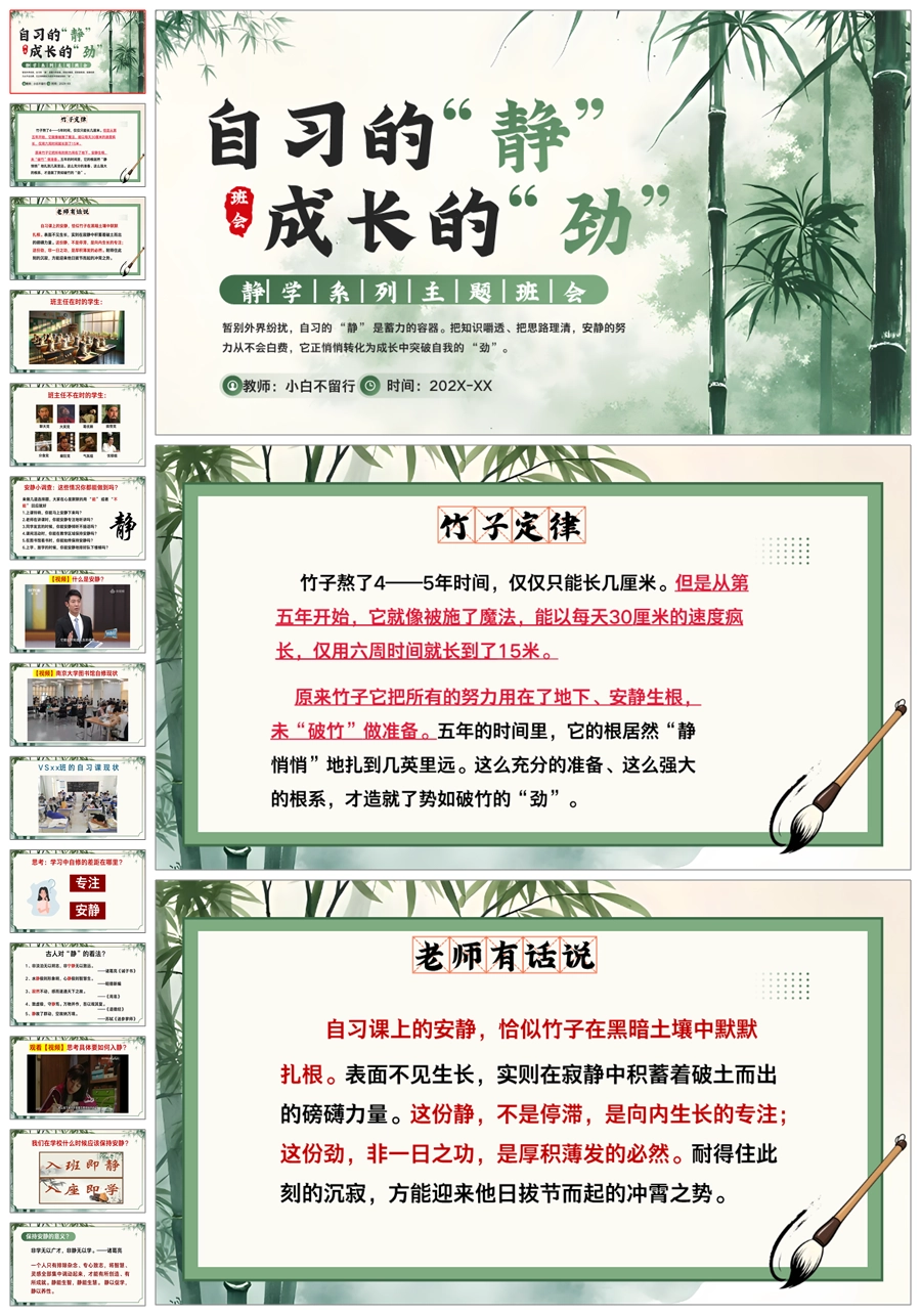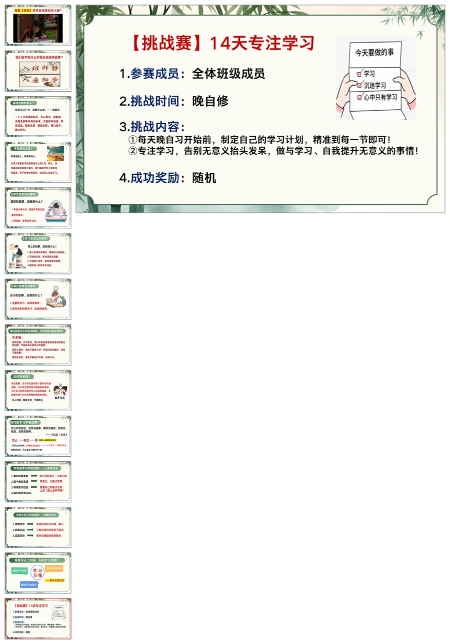 【5525】《自习的“静”成长的“劲”》静学教育主题班会ppt课件+发言稿+视频
