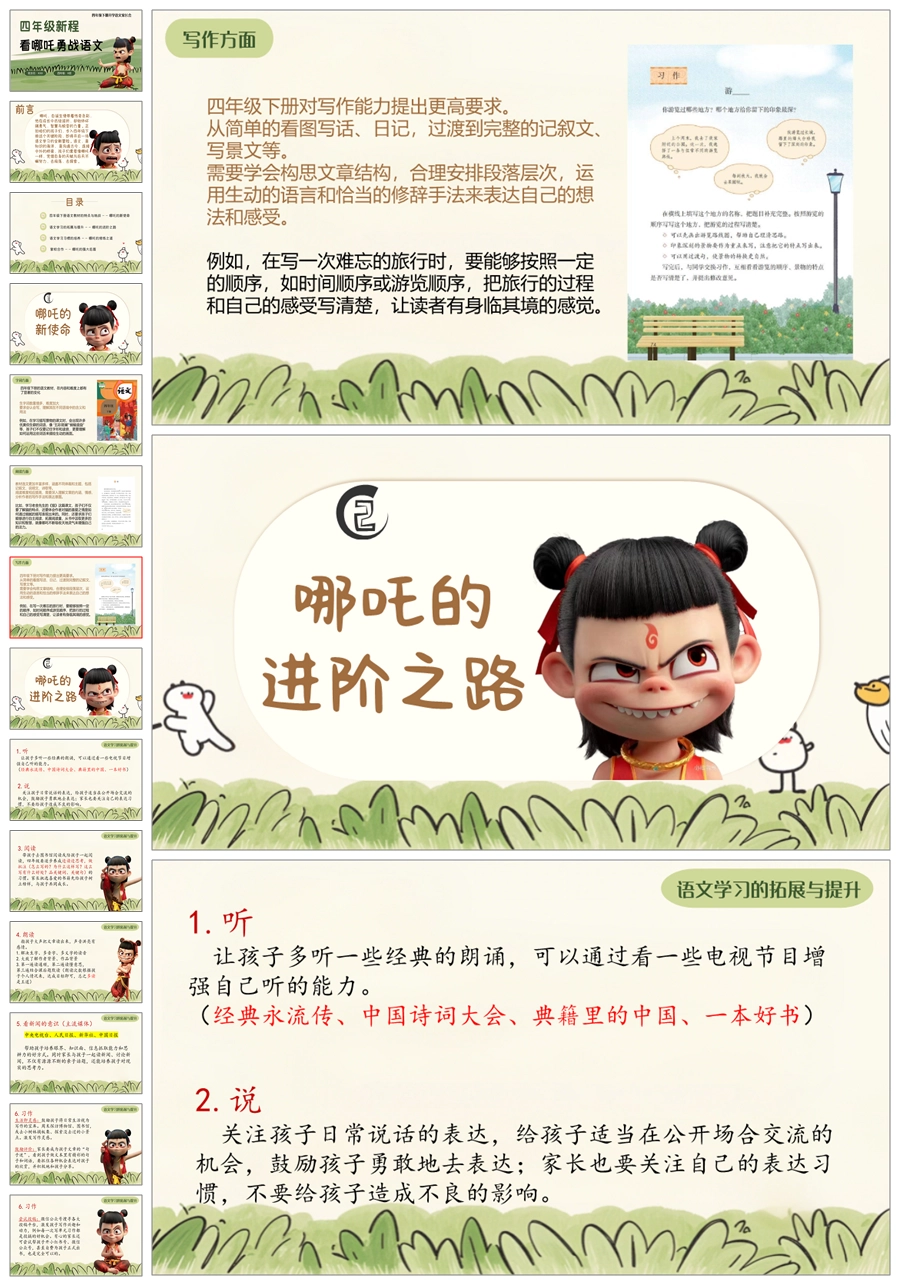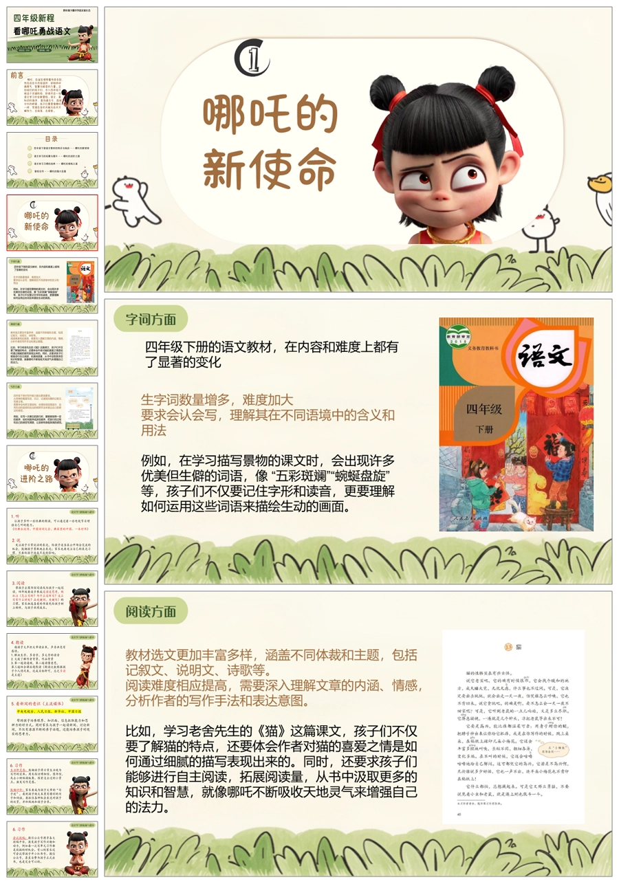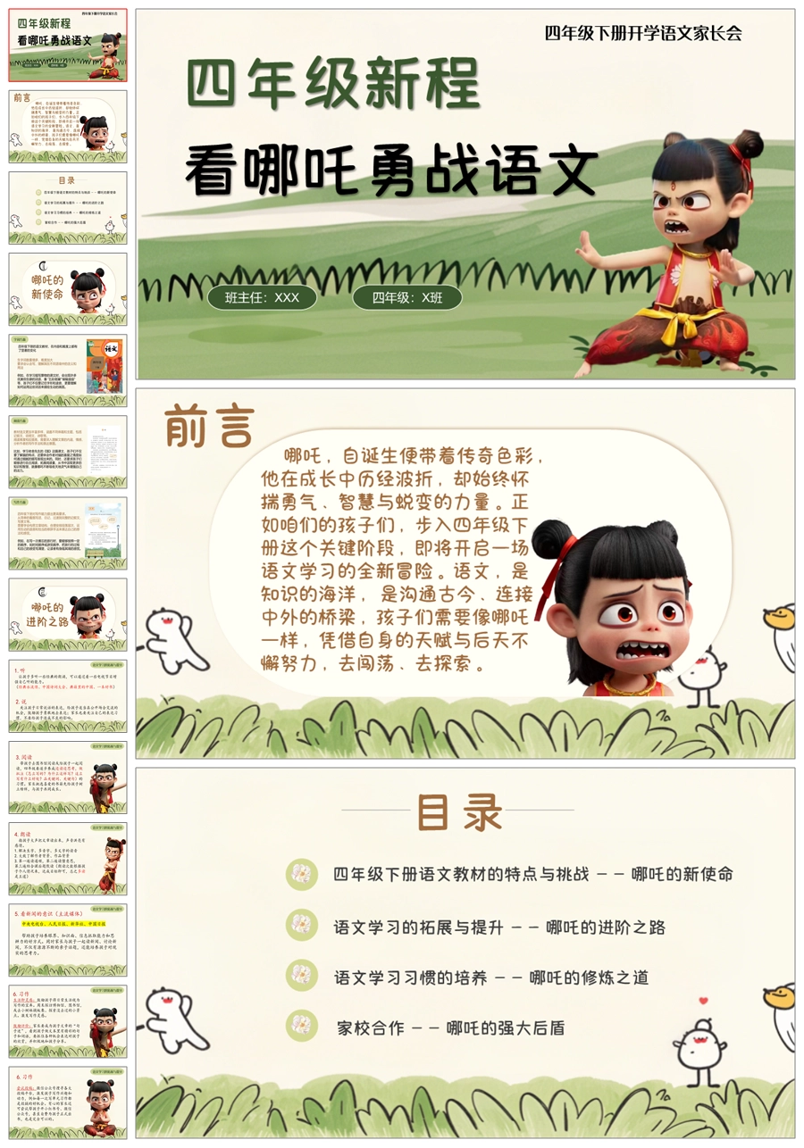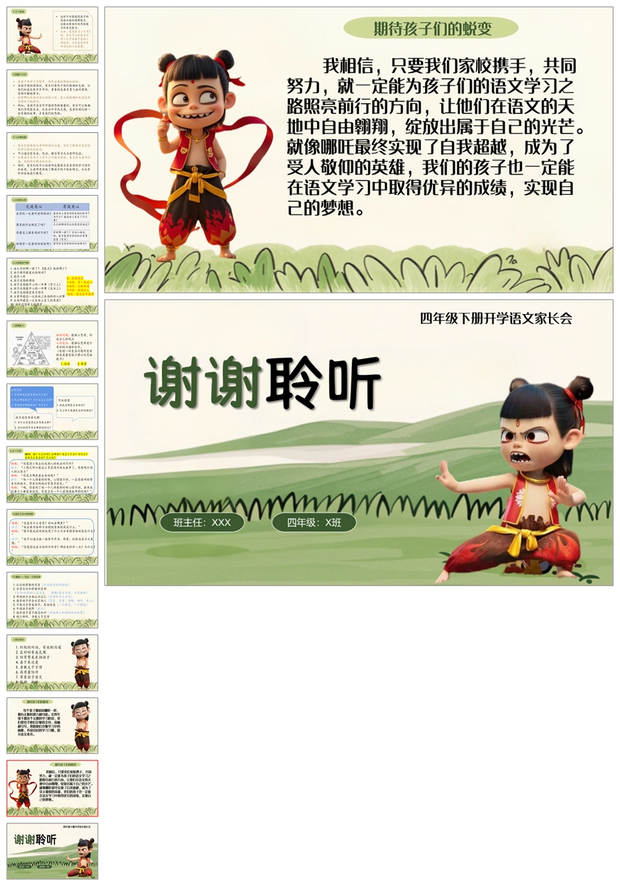【5603】《四年级新程看哪吒勇战语文》四年级下学期开学语文家长会ppt课件+发言稿