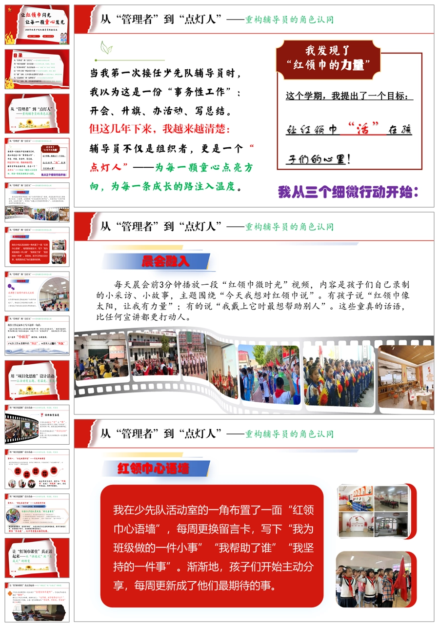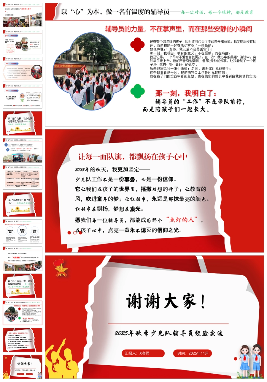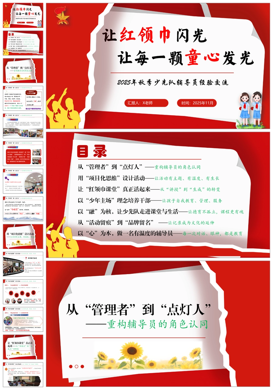 【5690】少先队辅导员工作经验交流稿《让红领巾闪光,让每一颗童心发光》PPT课件+发言稿