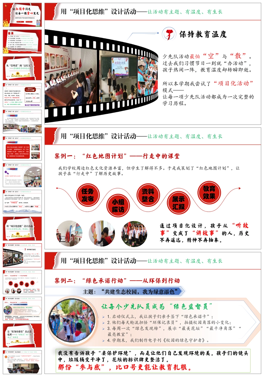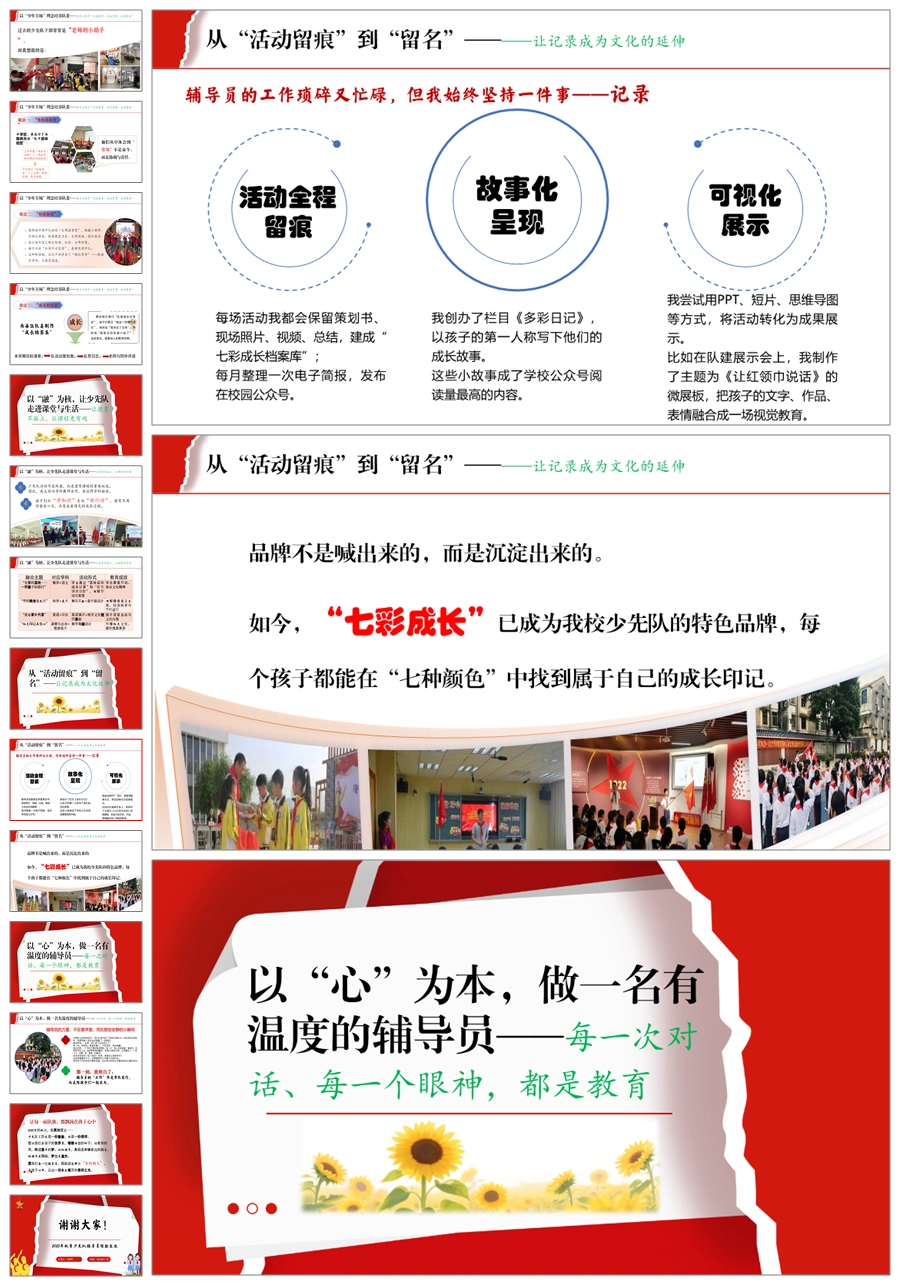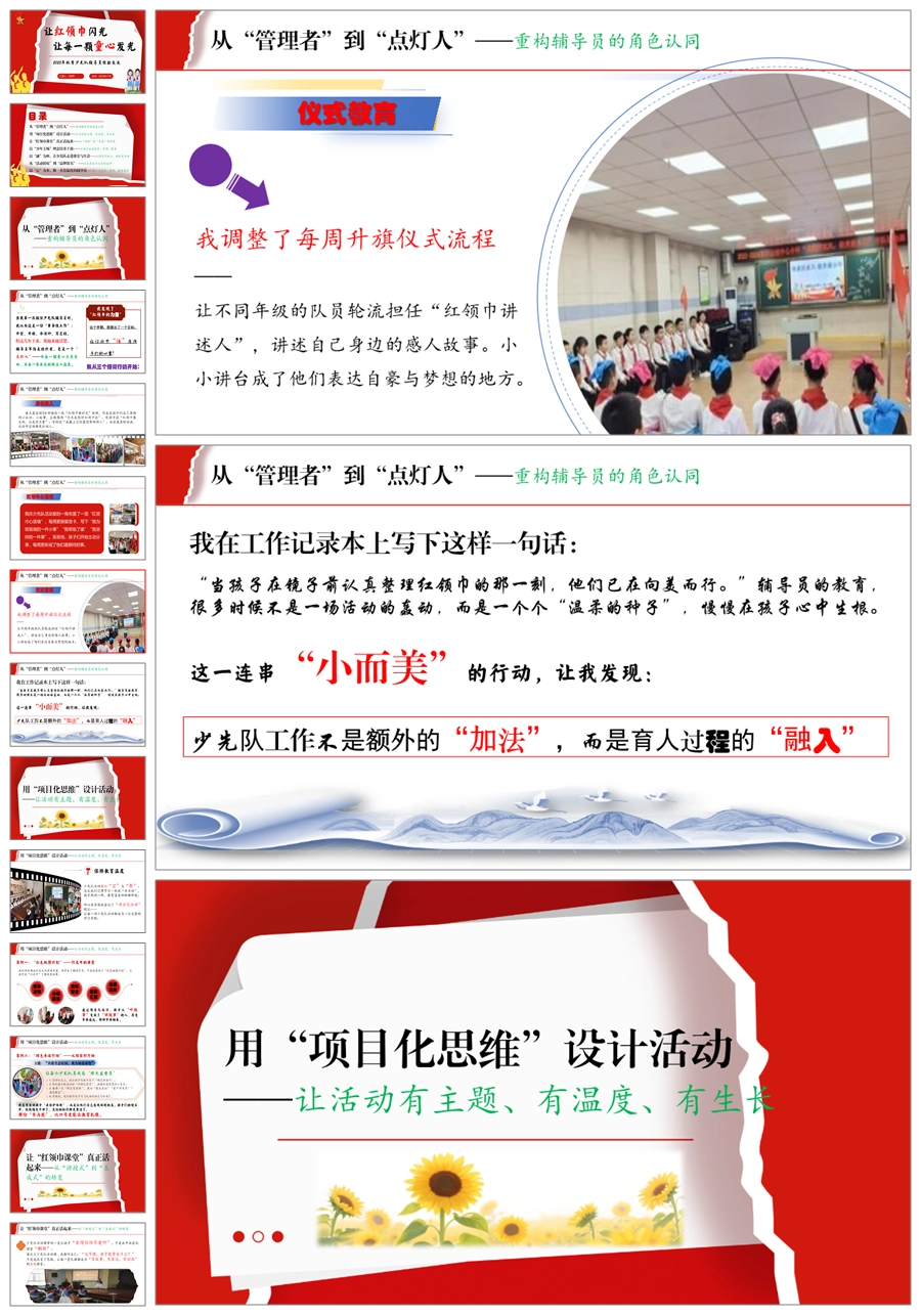【5690】少先队辅导员工作经验交流稿《让红领巾闪光,让每一颗童心发光》PPT课件+发言稿