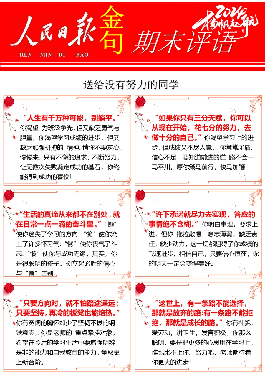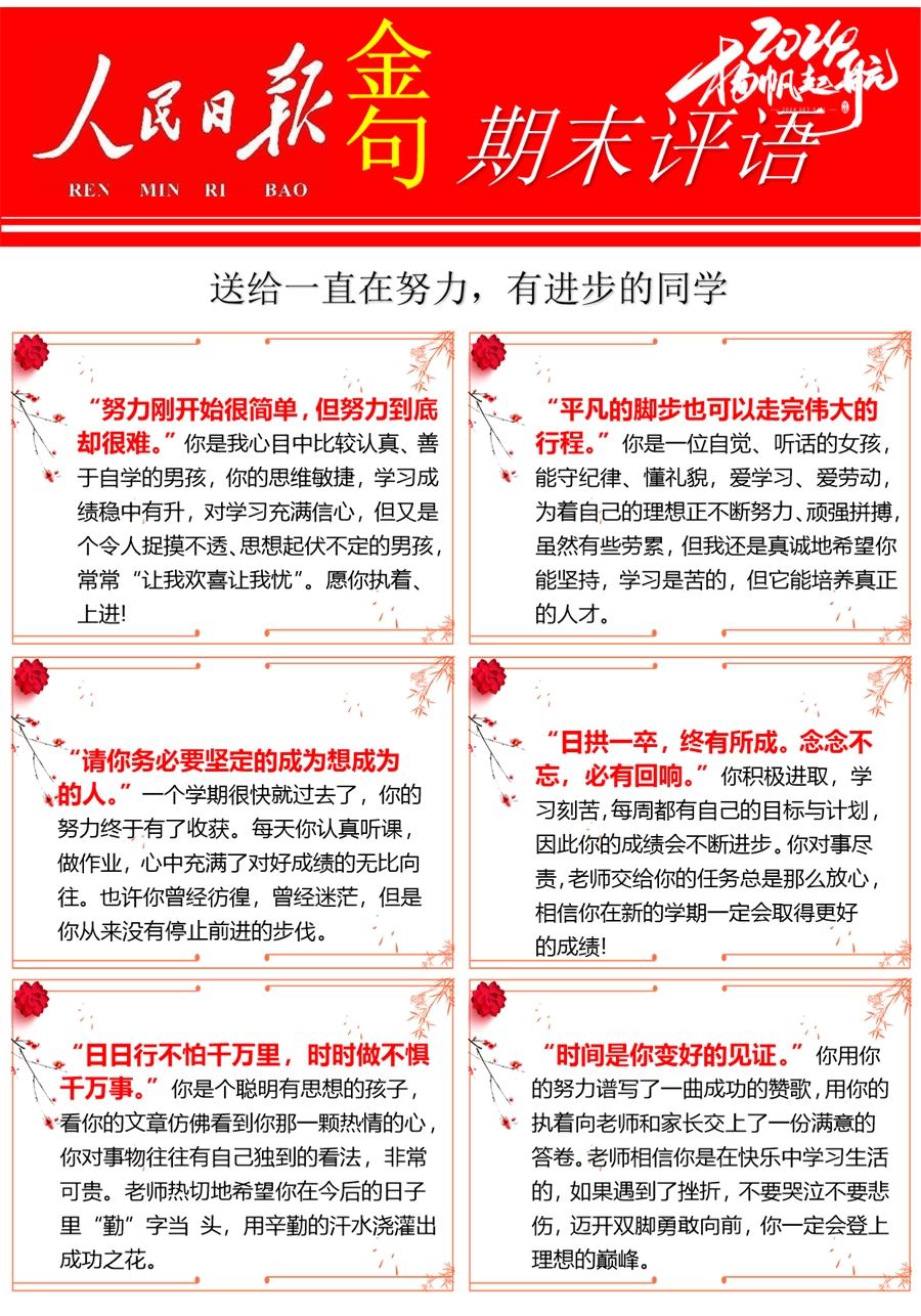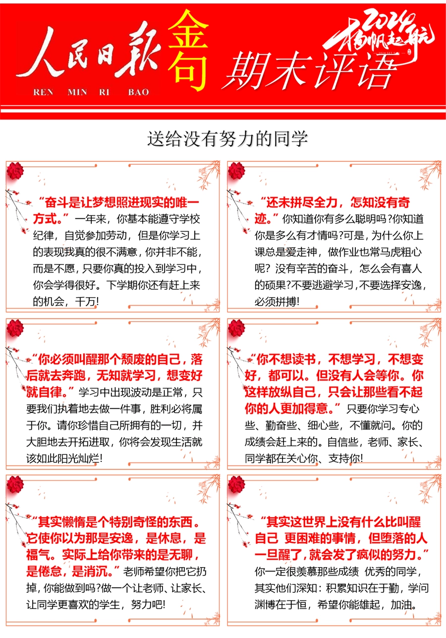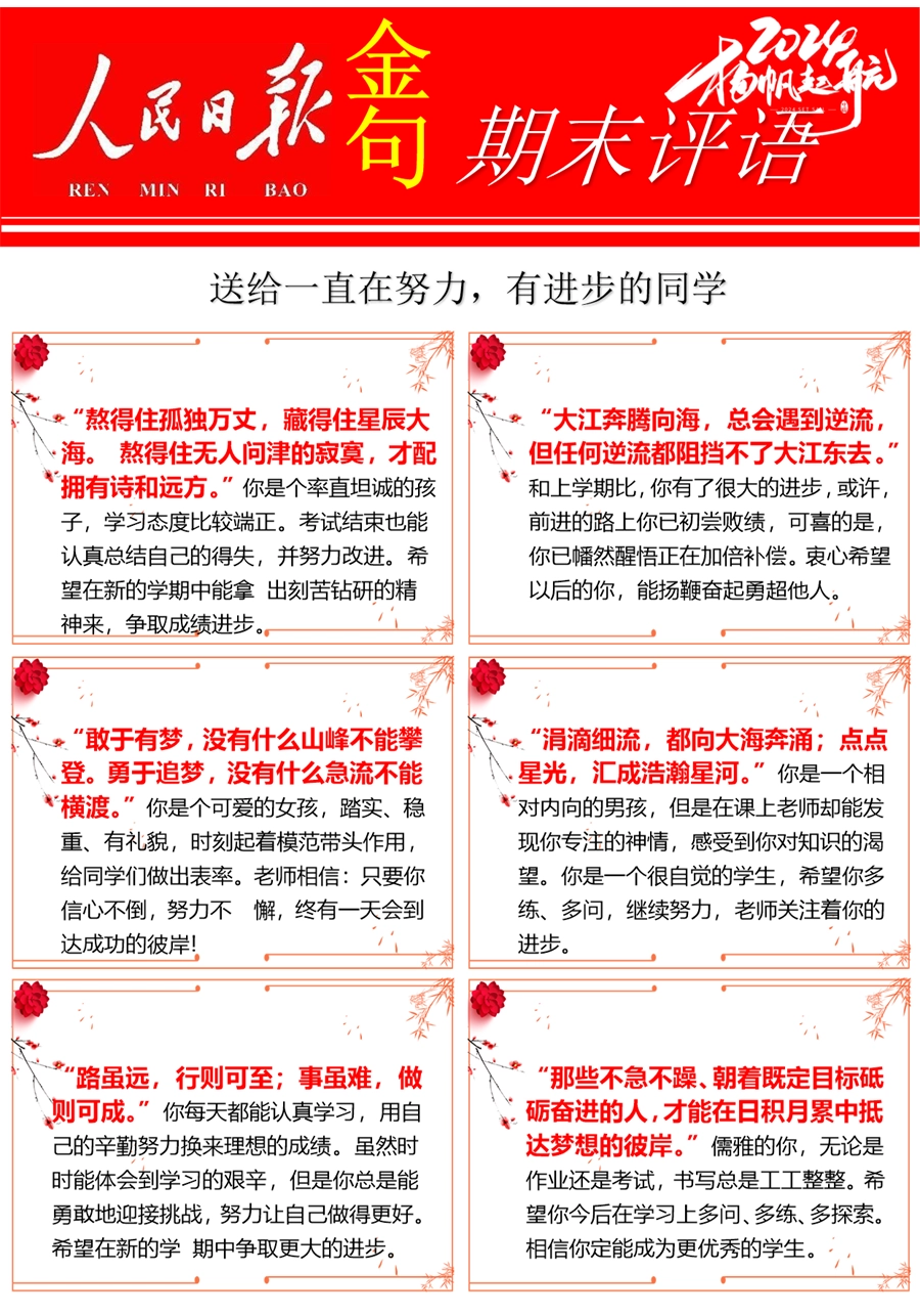 【期末学生评语】【人民日报】72则金句期末评语-每页6张