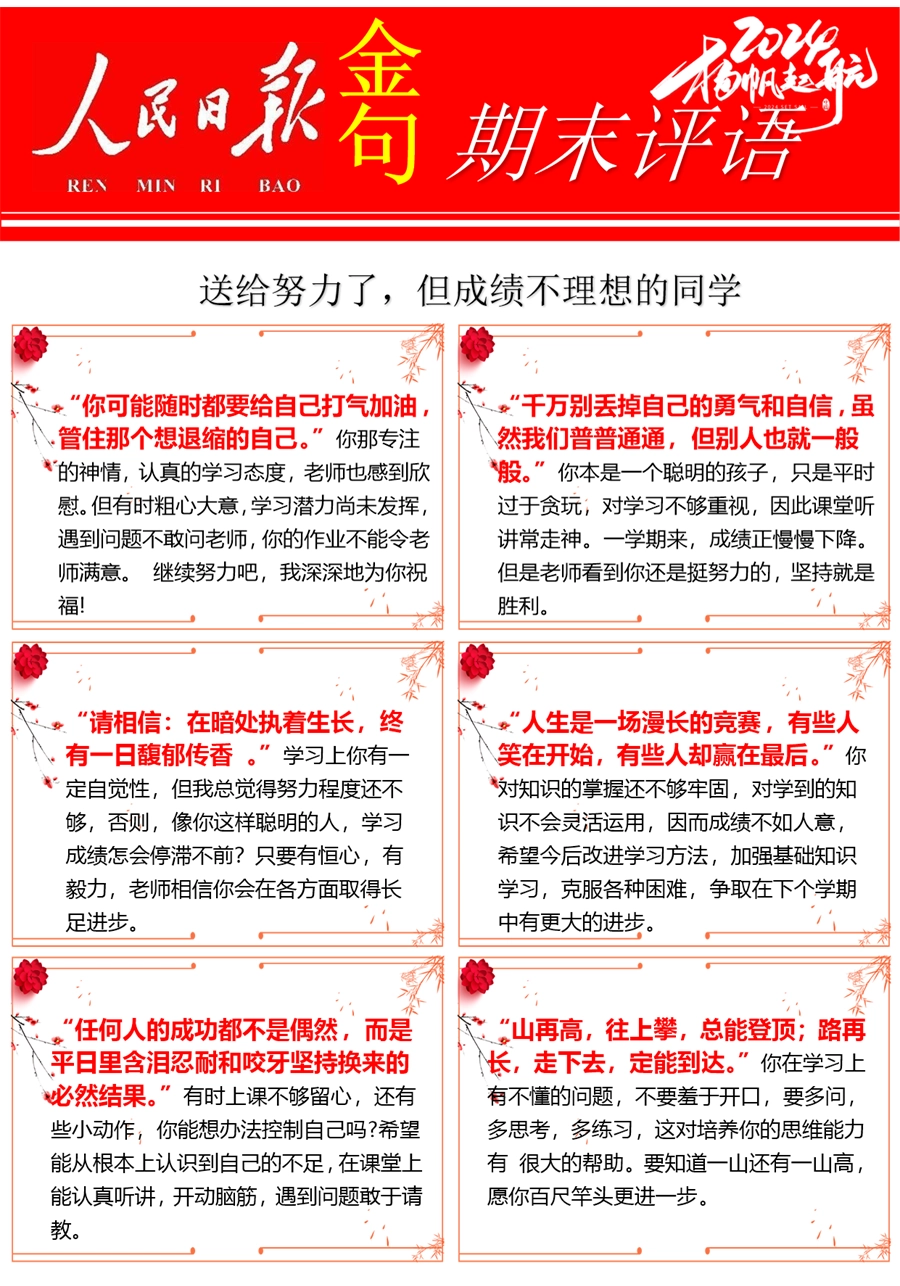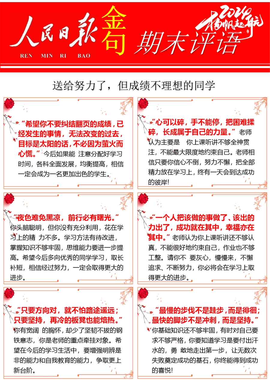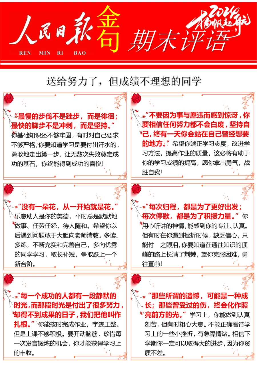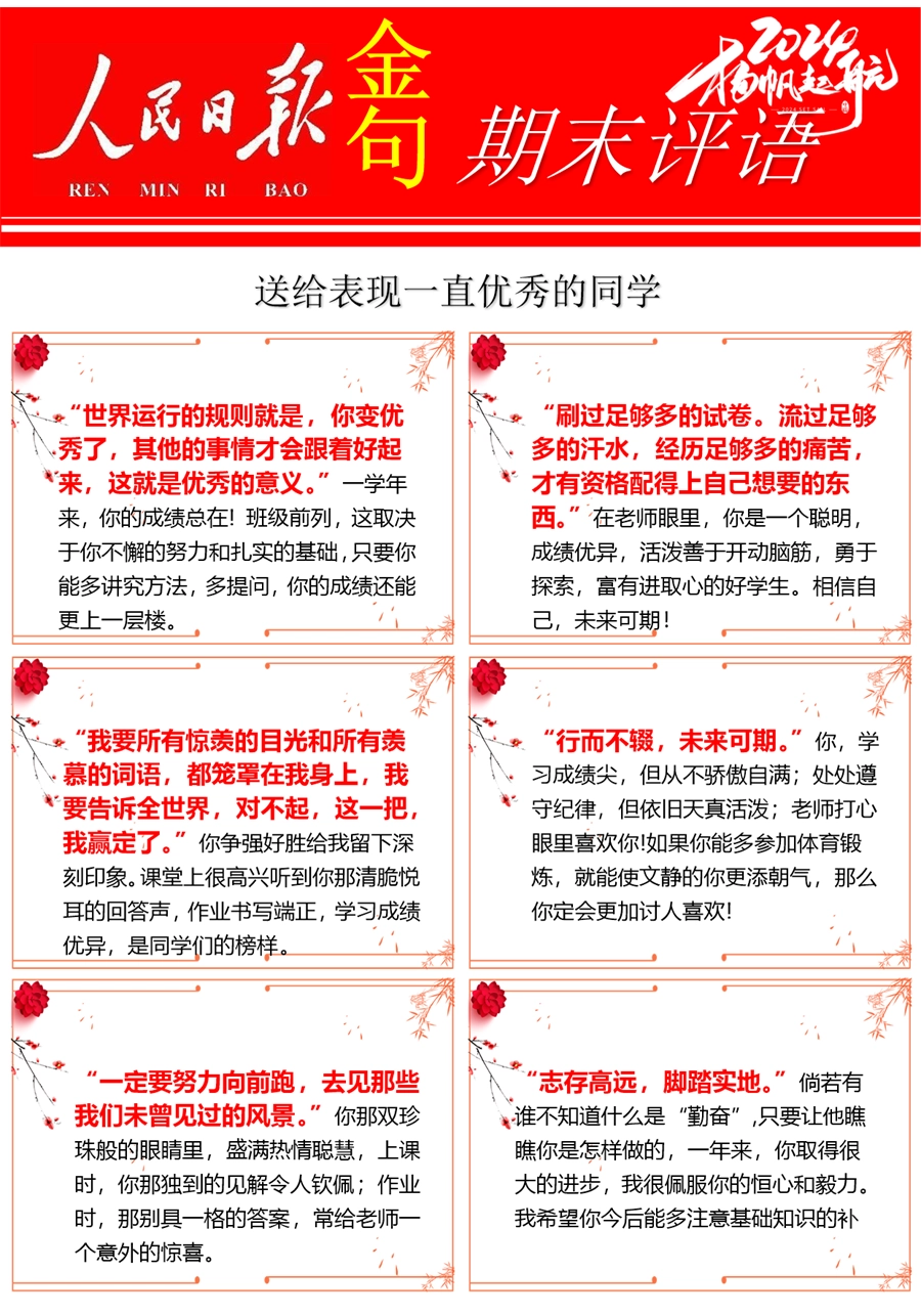 【期末学生评语】【人民日报】72则金句期末评语-每页6张