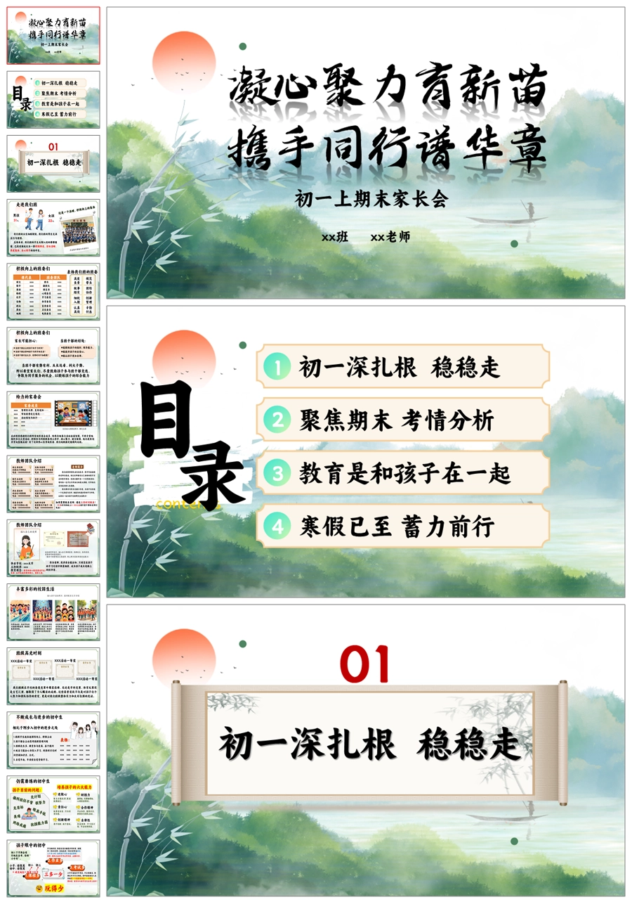 首页 中学家长会 【8635】【初一上期末家长会】《凝心聚力育新苗,携手同行谱华章》七年级上学期期末家长会PPT课件+发言稿
