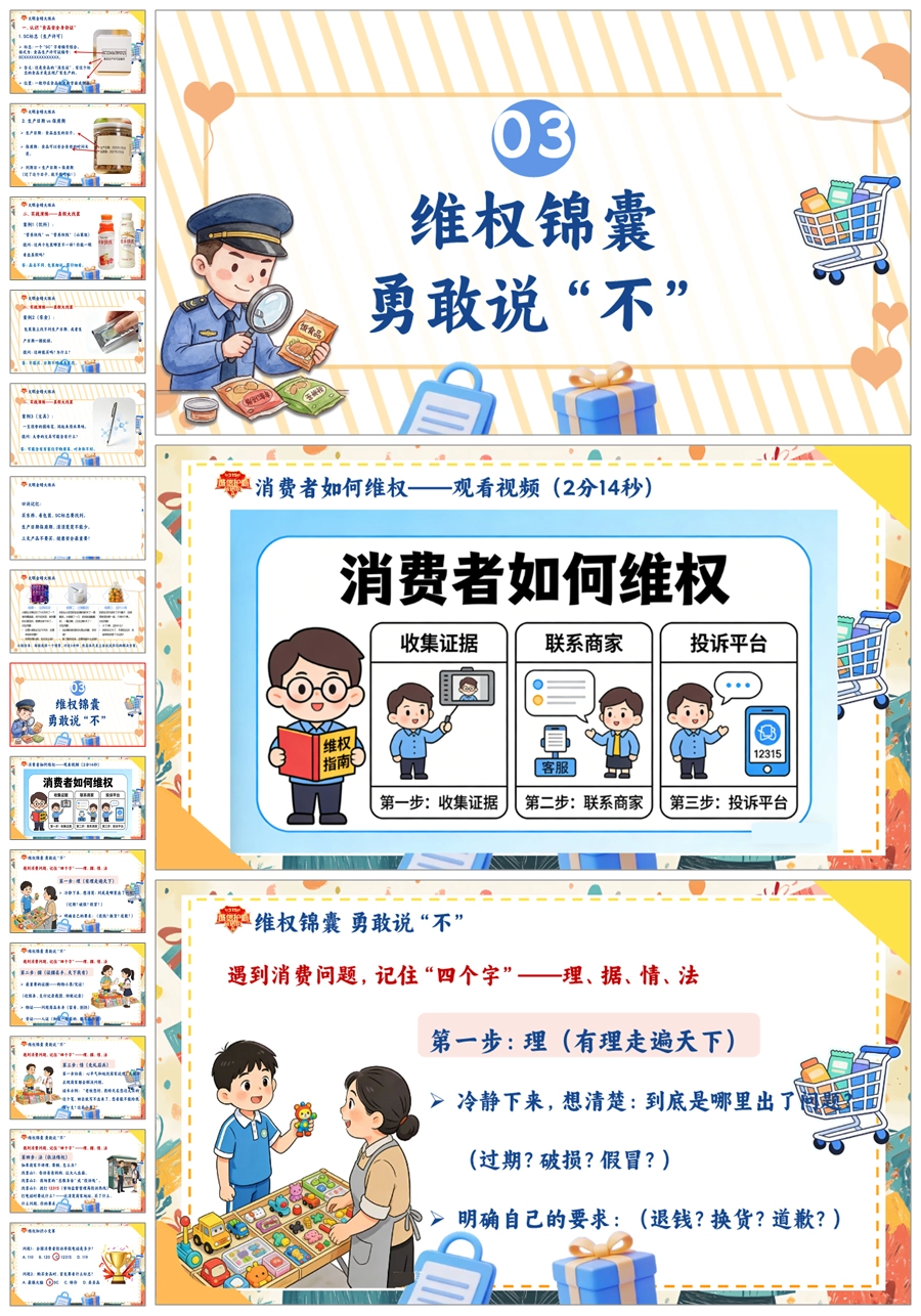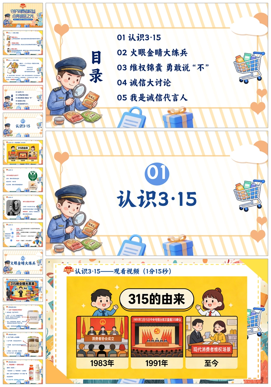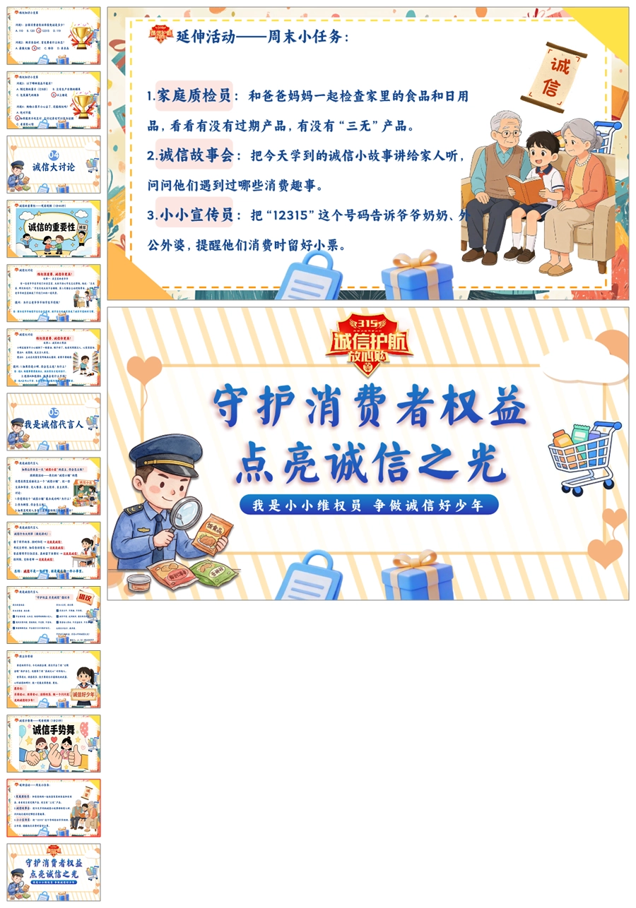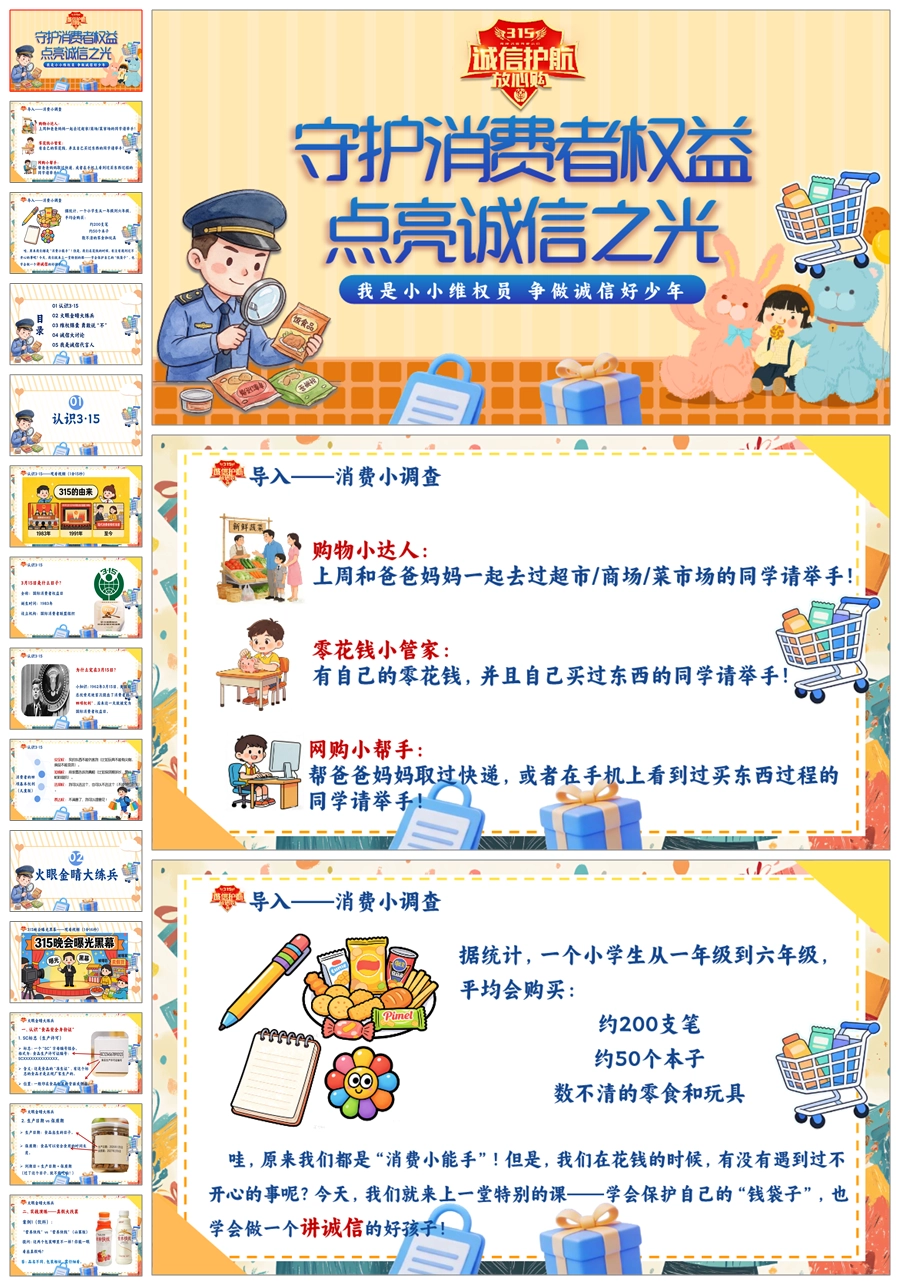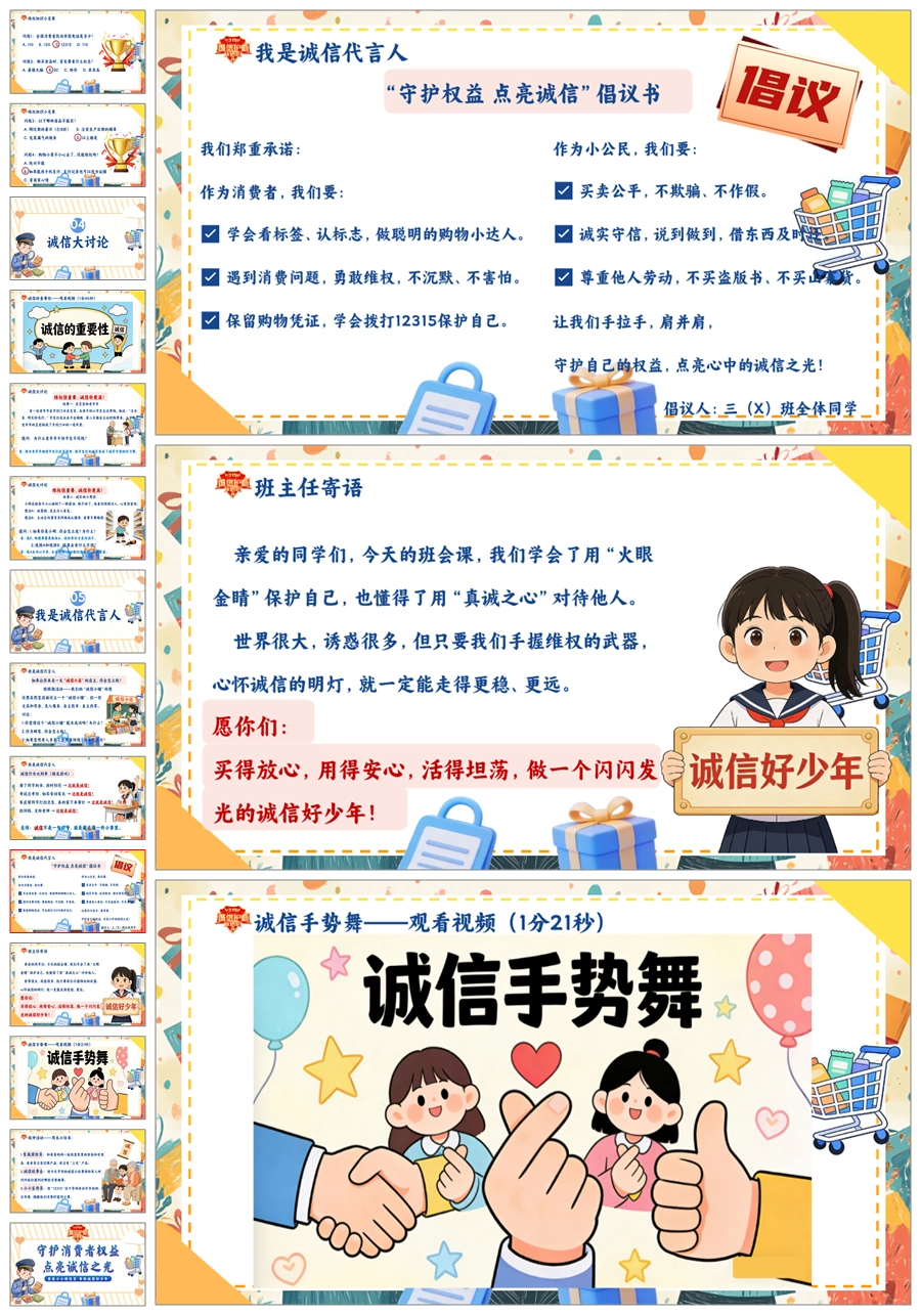 【8673】《守护消费者权益点亮诚信之光》315消费者权益日宣传教育课件主题班会ppt课件+视频+教案+主持稿