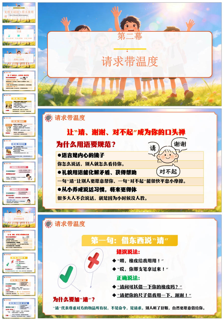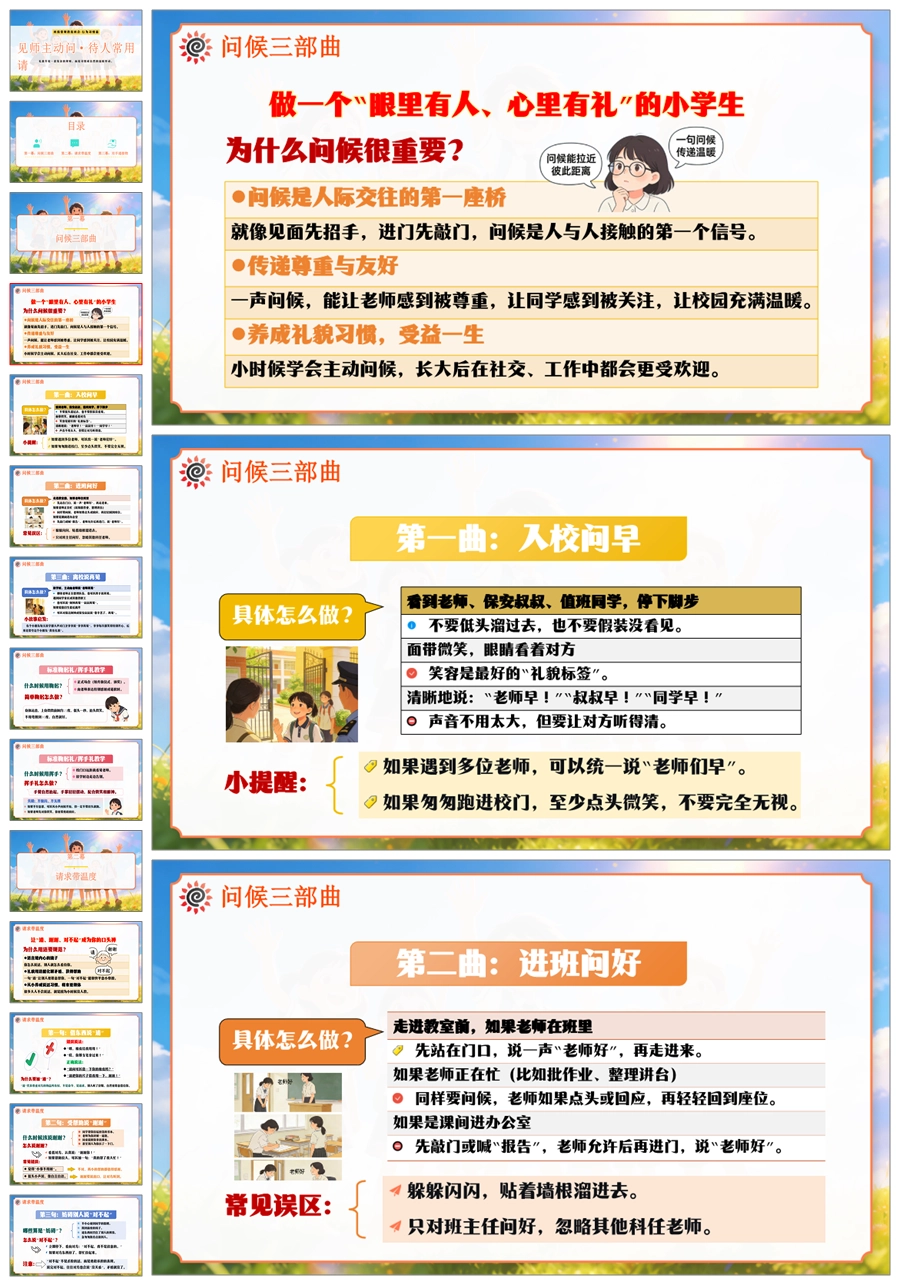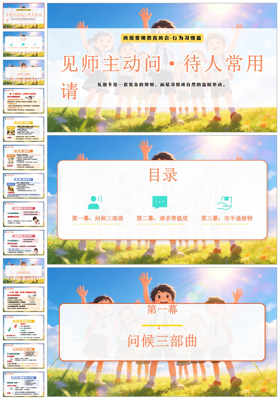 【6067】《见师主动问·待人常用请》班级常规教育文明礼仪小学主题班会PPT课件+教案