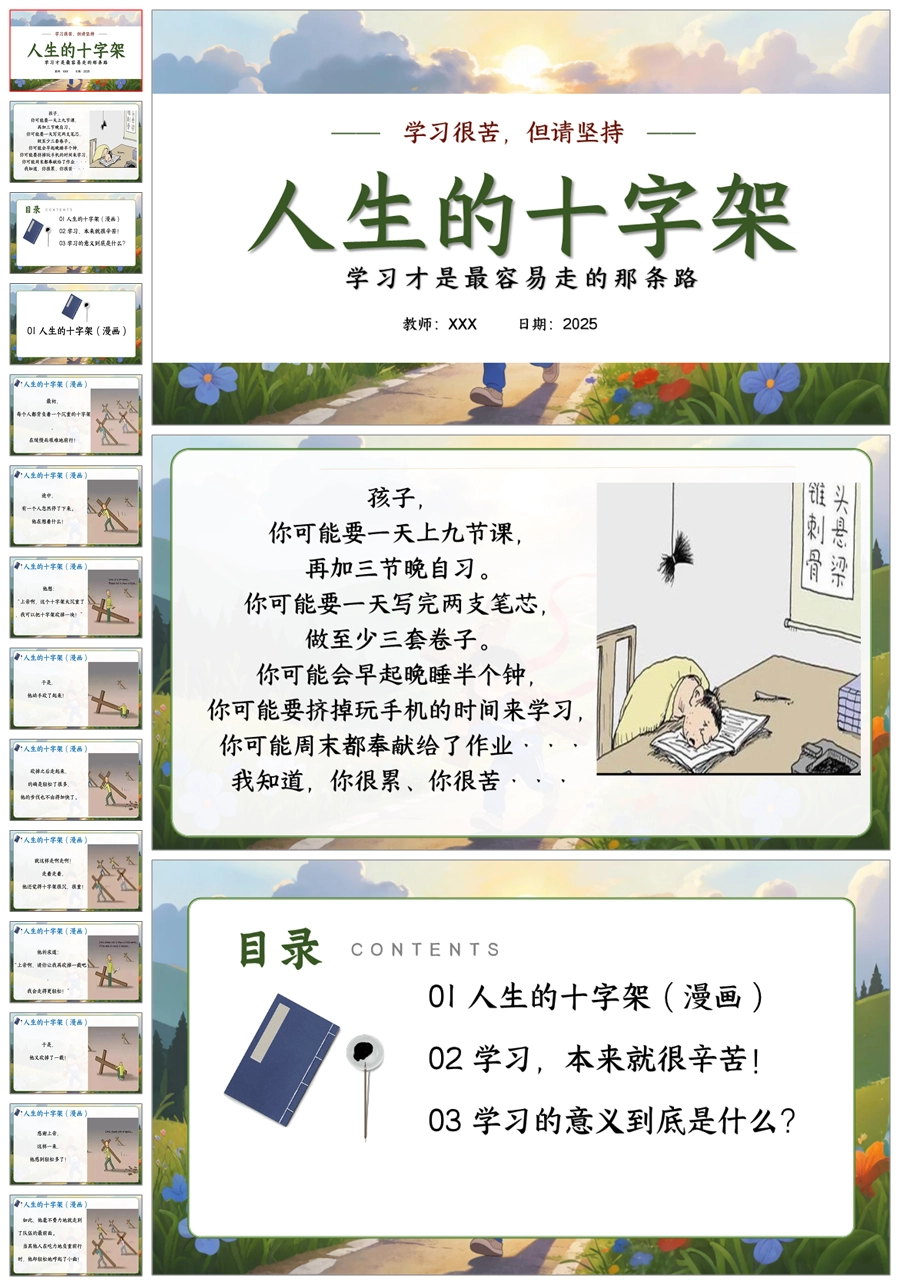 【6077】《学习很苦,但请坚持》人生的十字架主题班会PPT+逐字稿+教案