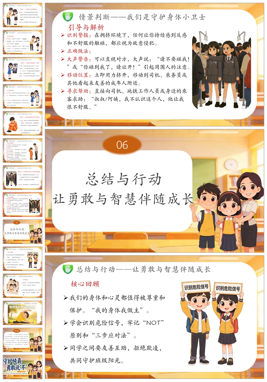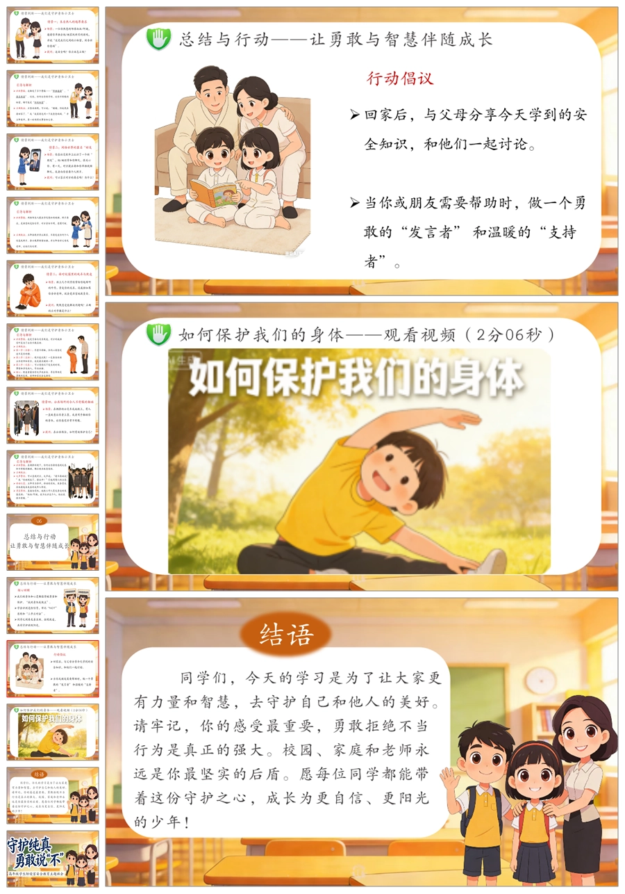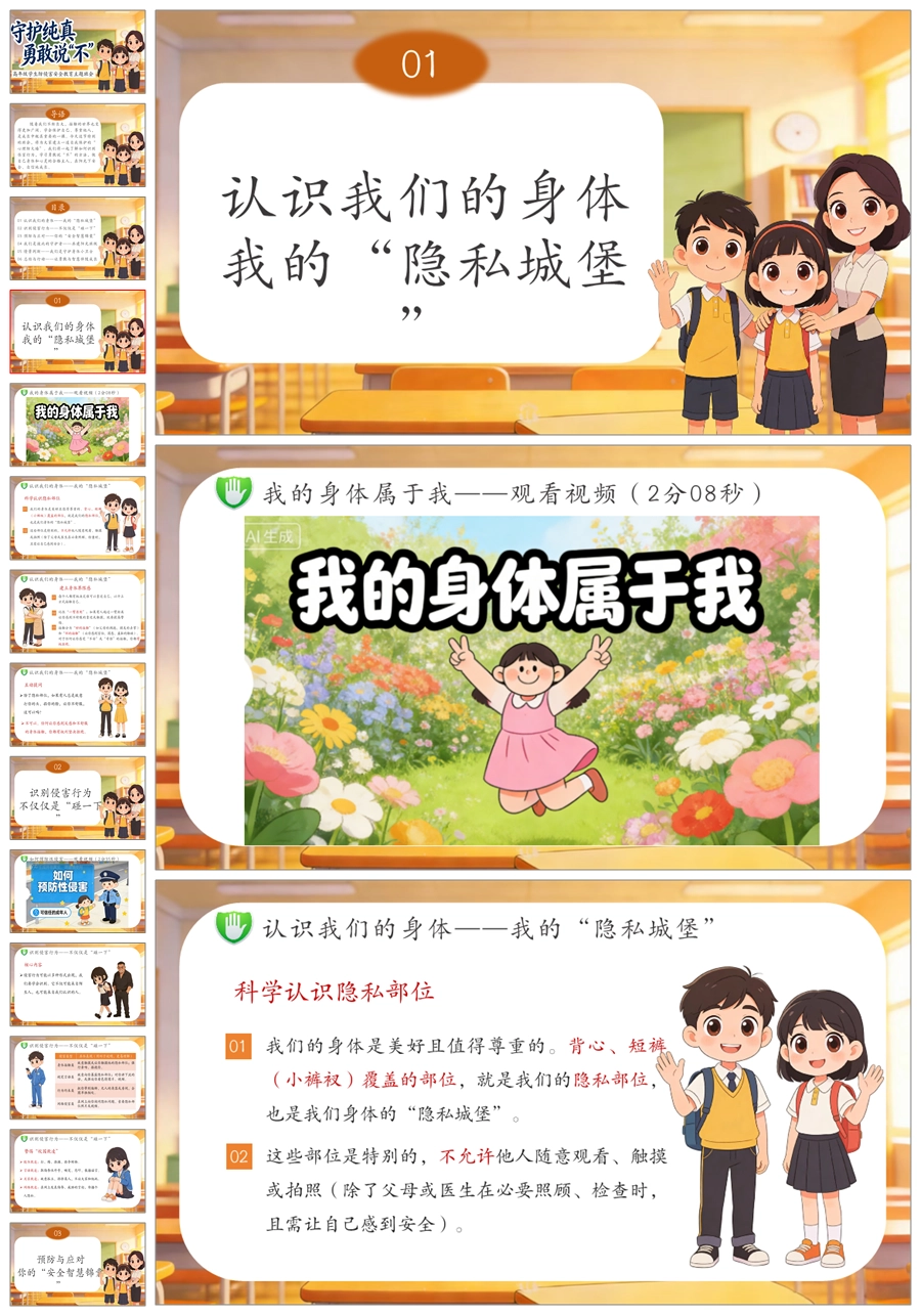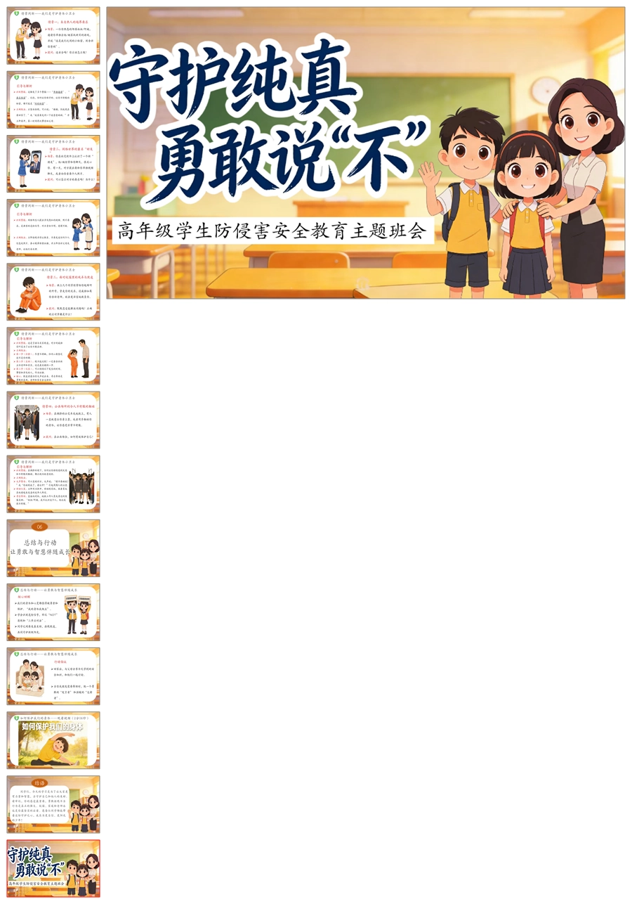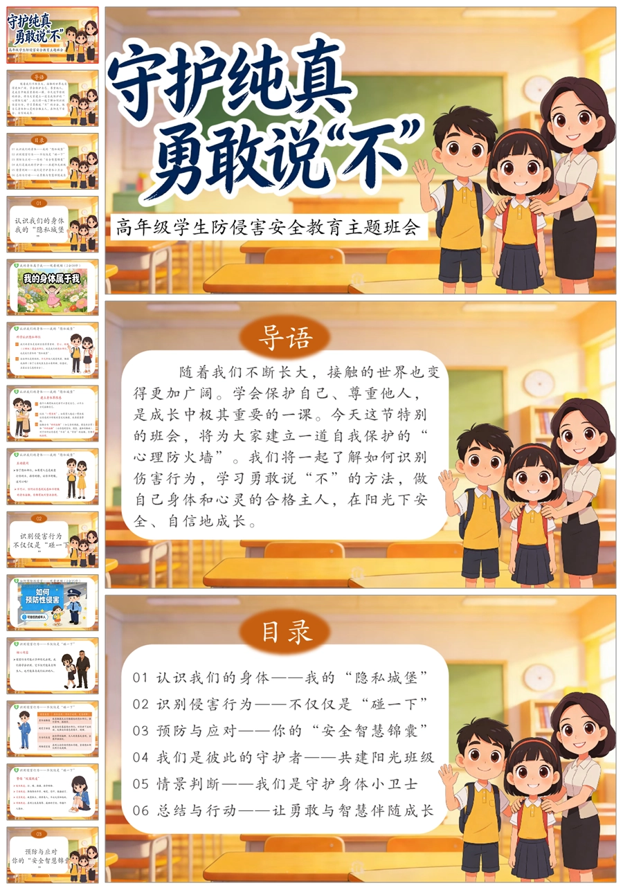 【6081】《守护纯真 勇敢说不》高年级防侵害安全教育主题班会PPT课件+演讲稿+教案+视频