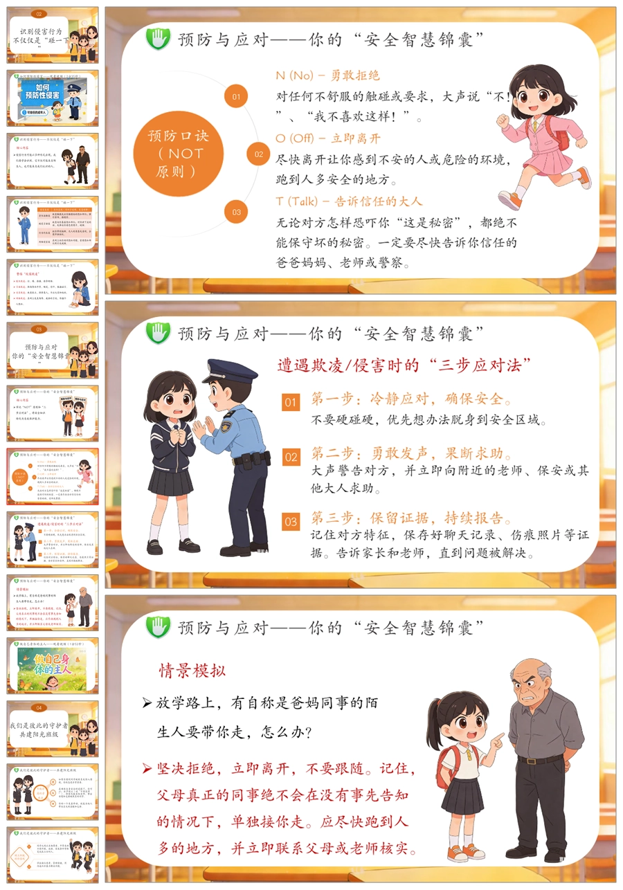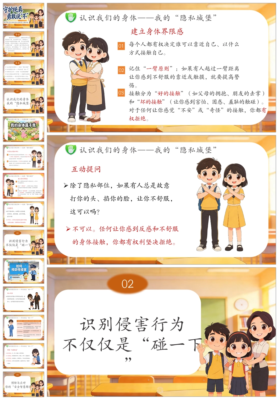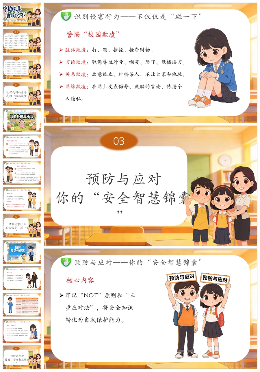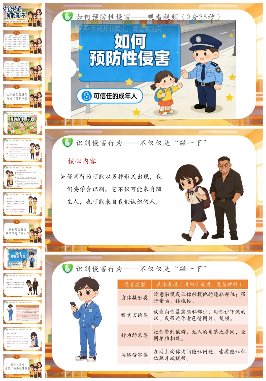 【6081】《守护纯真 勇敢说不》高年级防侵害安全教育主题班会PPT课件+演讲稿+教案+视频