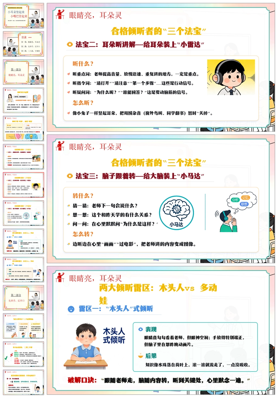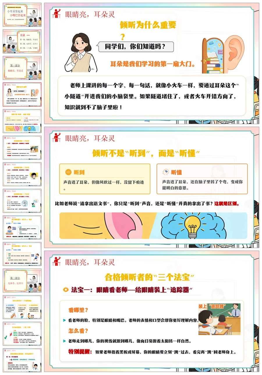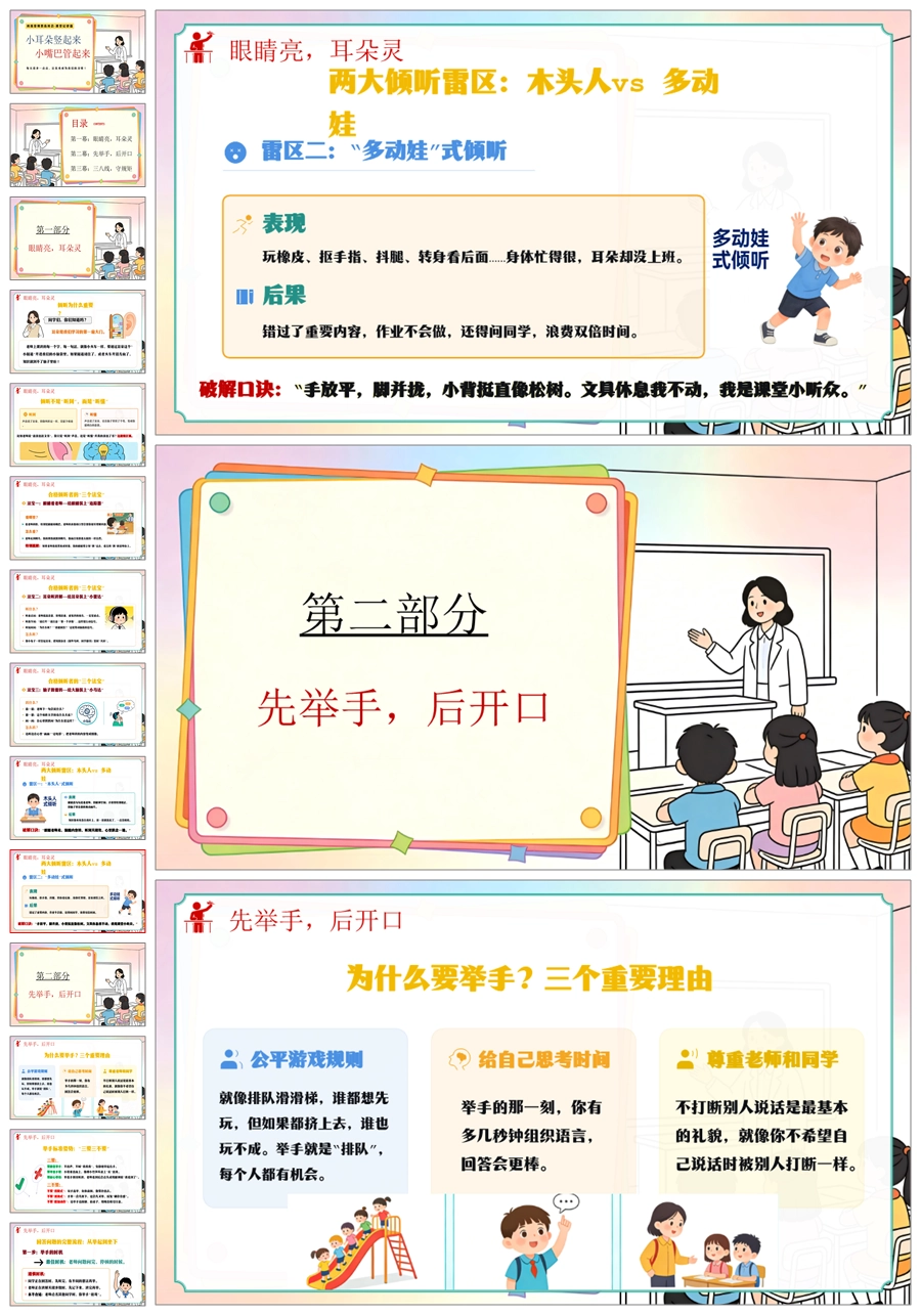 【6103】《小耳朵竖起来·小嘴巴管起来》班级常规教育班会-课堂纪律篇小学主题班会PPT课件+教案