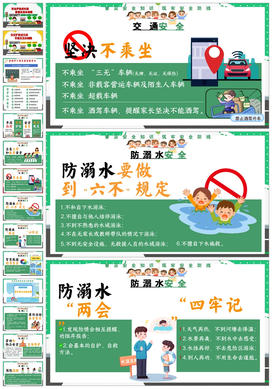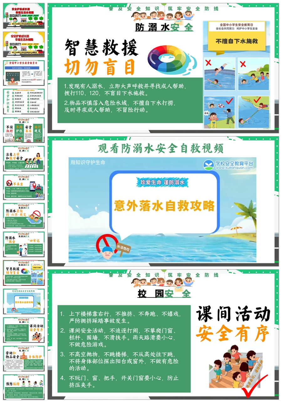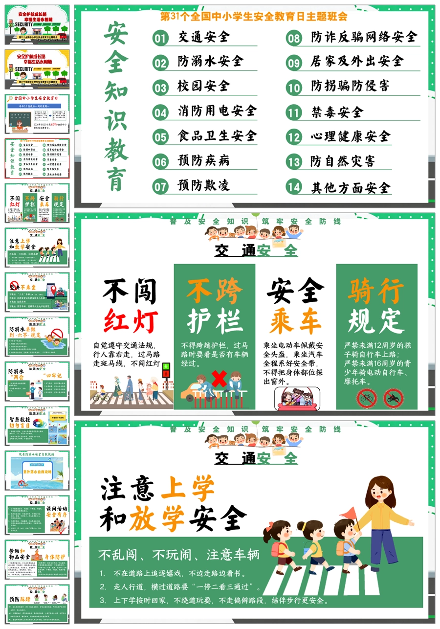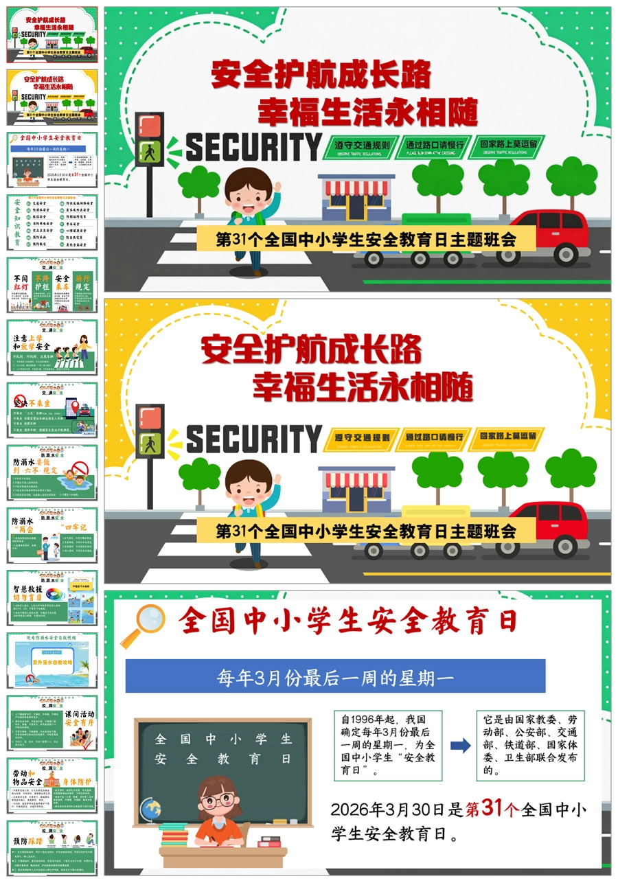 【8676】《安全护航成长路》全国中小学生安全教育日主题班会PPT课件+教案+视频