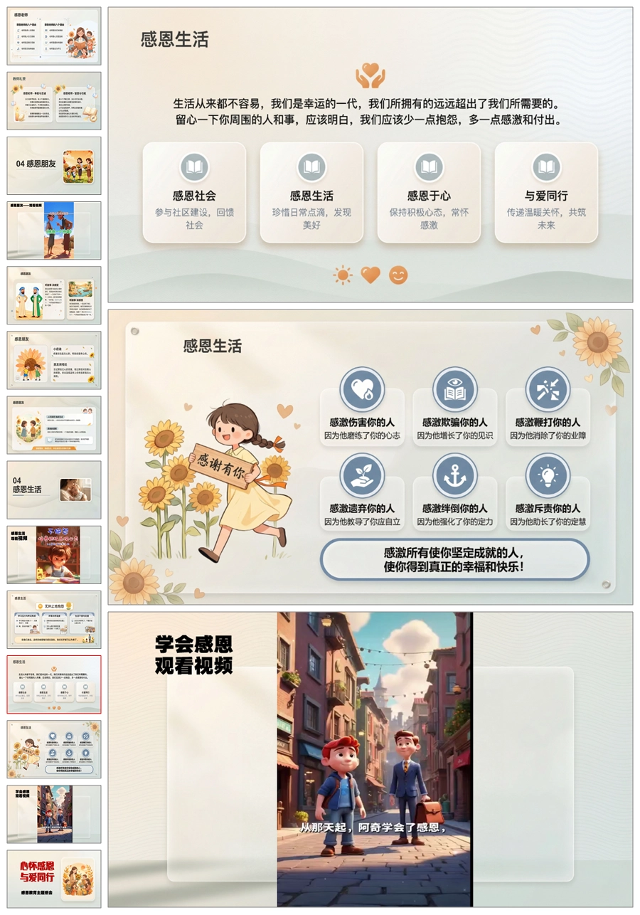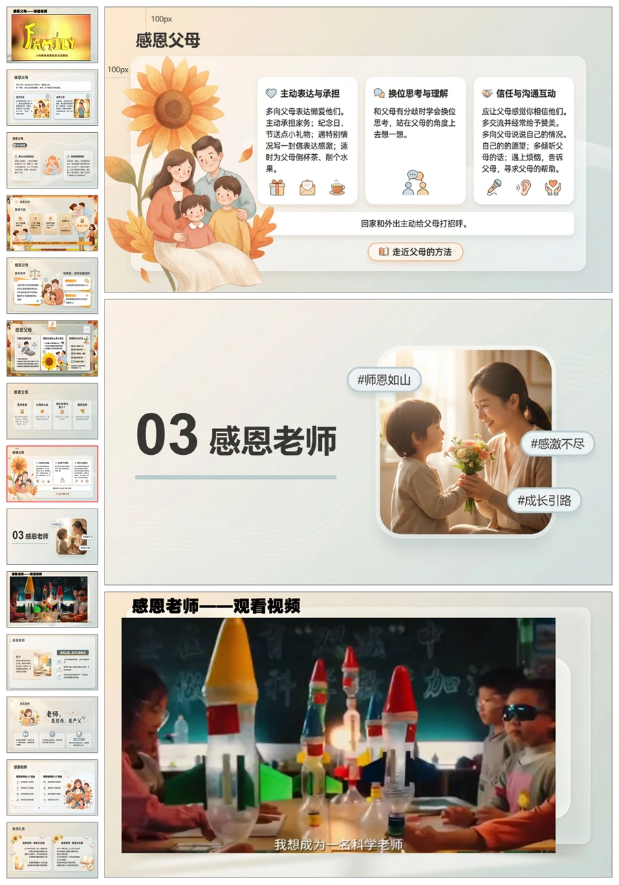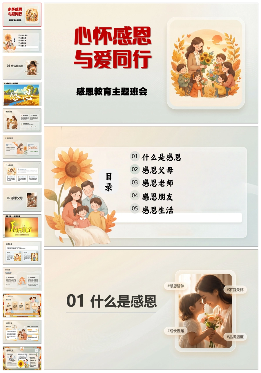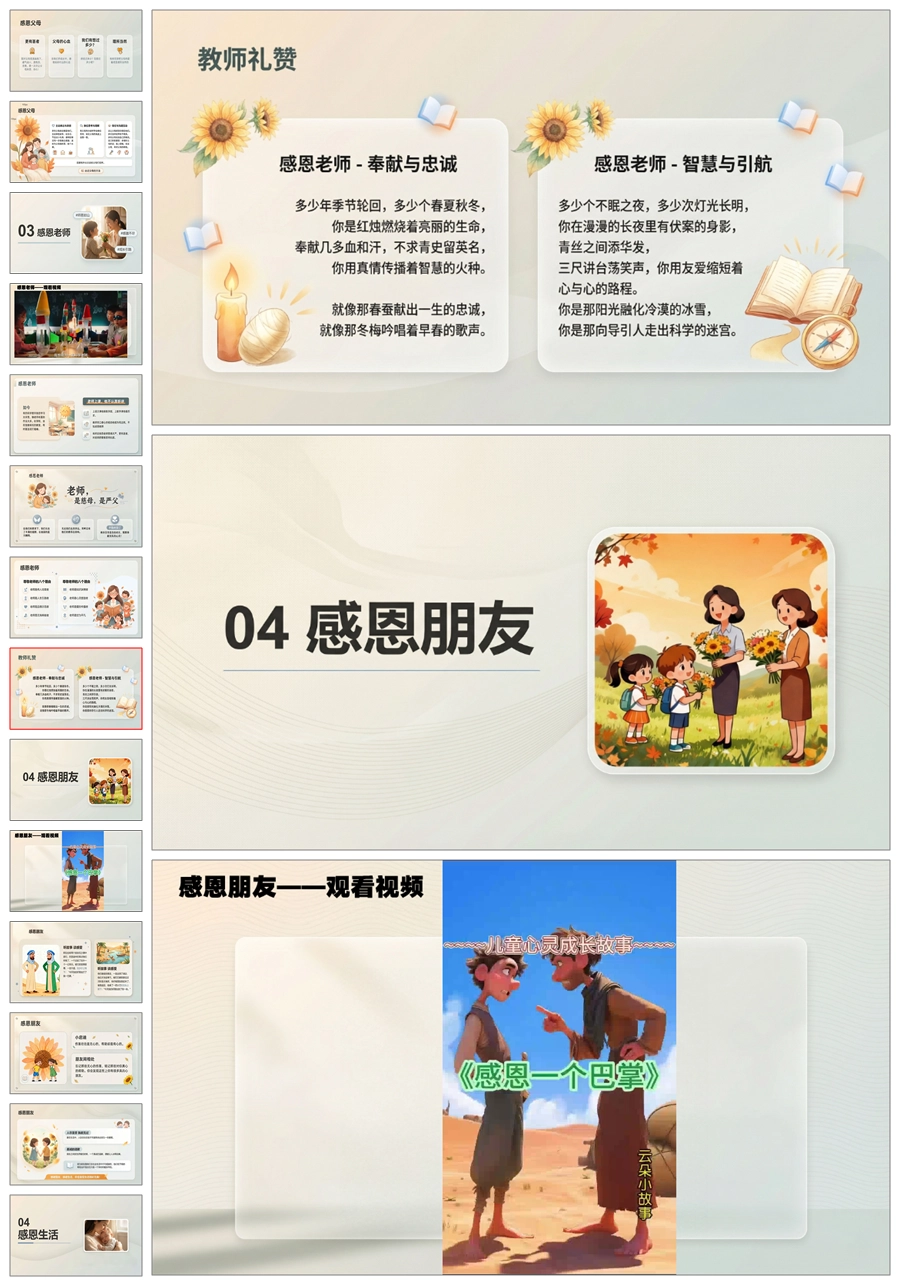 【8691】《心怀感恩与爱同行》感恩教育主题班会ppt课件视频+教案+主持稿2